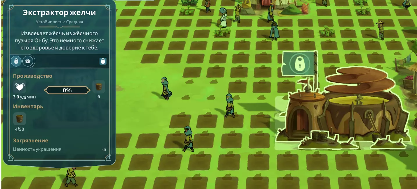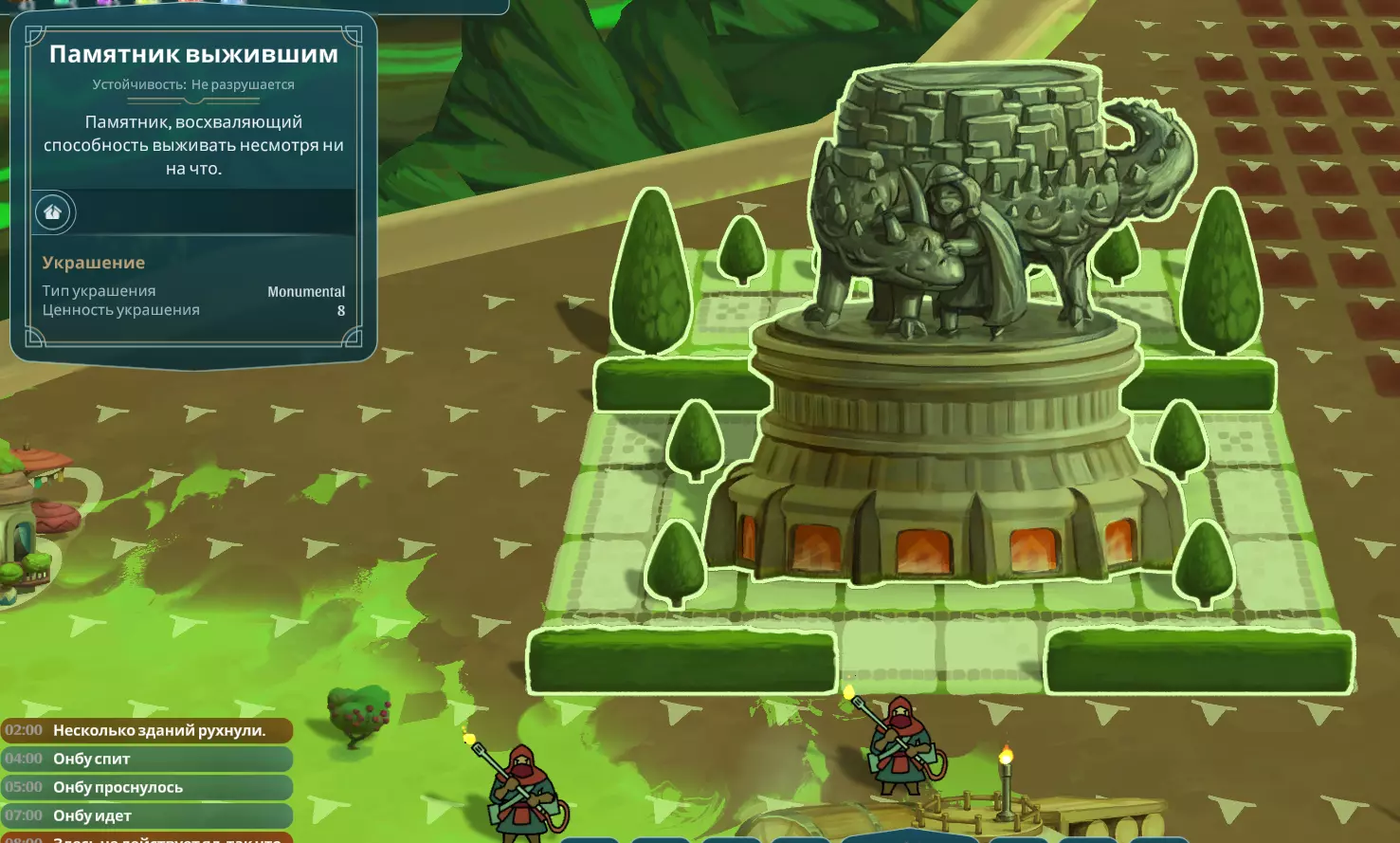 【隐藏成就】 建造翁布纪念碑。 要获得建造翁布纪念碑的机会,当地图上出现死亡的翁布时,需满足以下条件: - 翁布对您的信任度必须很高。这意味着绝对不能执行任何会降低信任度的行为:敲打背上的尖刺、建造伤害翁布的建筑(用于获取胆汁、血液、石头等)。允许中毒值和饥饿值提升至20%以上,或生命值降至90%以下。高信任度的表现是翁布经常摇尾巴。但仍然不可以先移除背上的尖刺,再提升信任度。原则上,信任度在第100天前不应有任何下降。需要大量的草药来制作解毒剂,以及蘑菇来喂养翁布。最好经常喂养翁布(Onbu),即使中毒值很低也要及时治疗。 - 居民的总体效率不应超过100%。可以保持在95-97%的水平。通过建造/拆除装饰以及增加/减少食物多样性,可以轻松控制效率水平。 如果你的饥饿度超过20%,也没有什么大不了的。只需快速喂饱你的小家伙。要完成该成就,你必须建造【纪念碑翁布】(Памятник Онбу)。