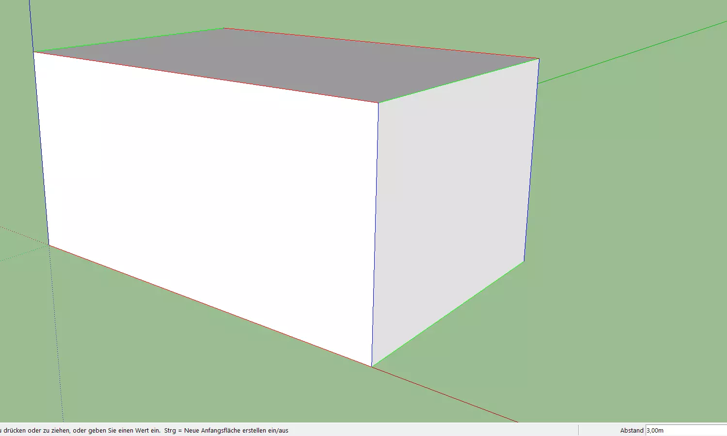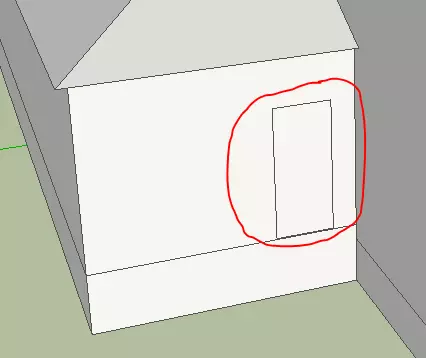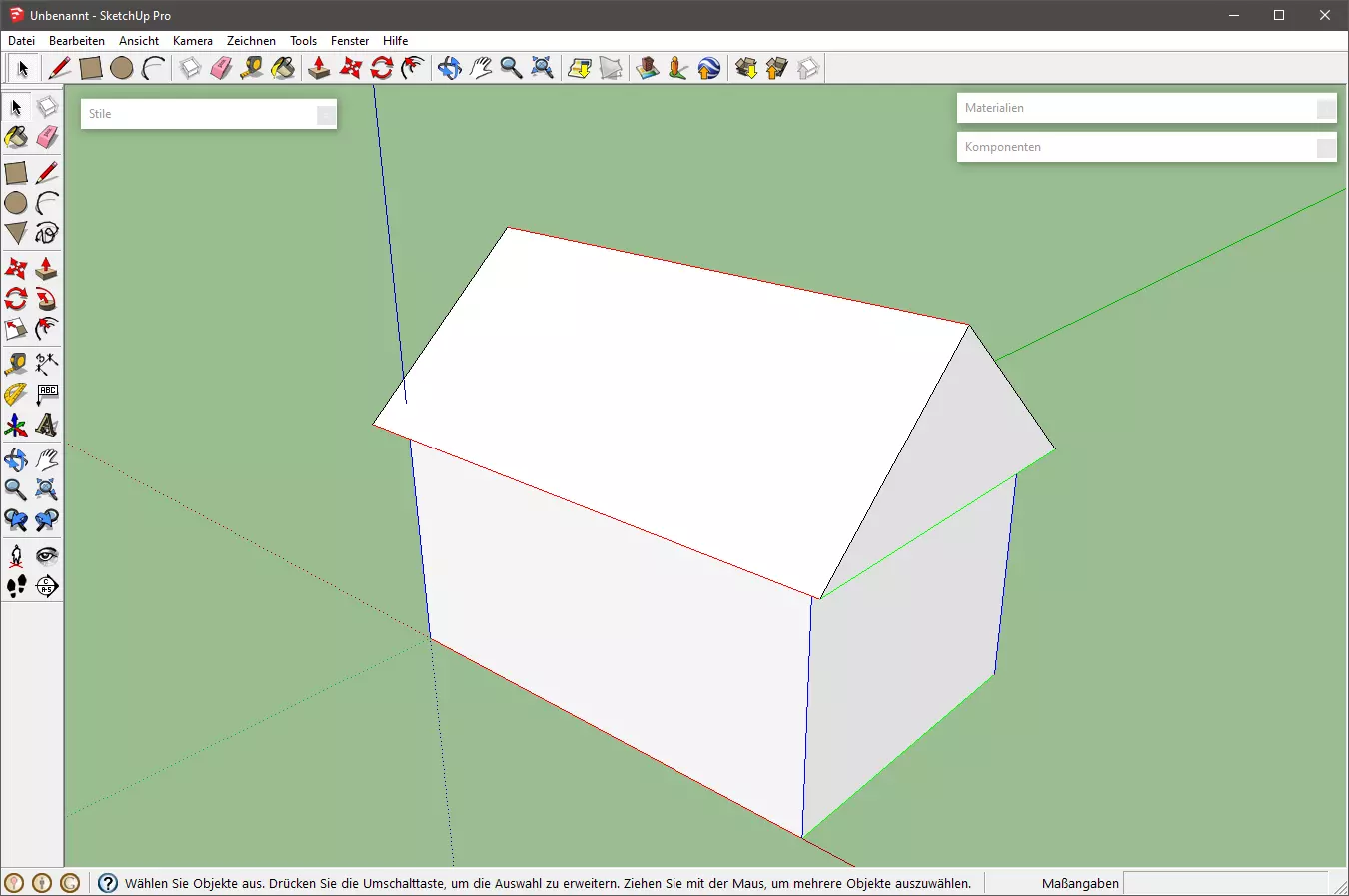 从短边中心向上绘制一条直线。该线必须变为蓝色(表示垂直线)。输入“2”作为长度。在对边重复此步骤,然后绘制第三条线将两个上端点相互连接。 为了完成屋顶,用线条将四个角与山墙连接起来,注意SketchUp会自动为所有被包围的三角形和平面矩形创建面。然后可以选择并删除每个正面的两条垂直线(这将合并它们旁边的共面)。