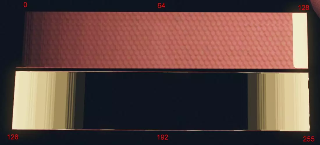 复制你之前制作的基础纹理。为了补偿(无论出于何种原因)游戏中颜色会显得更亮、饱和度更高的问题,此副本的亮度应降低至约155,饱和度调低25%。然后将此副本另存为【建筑名称】_d.png。它可能看起来像右侧的示例。 为了让建筑在夜间发光,建议从此最终图像创建一个发光纹理(以及可选的高光纹理)。为此,你需要一张灰度图像,其中窗户具有特定范围的灰度值(例如140用于常亮灯光),而其余部分(夜间会变暗)必须使用灰度值192。 以下是我使用旧版“PhotoImpact”软件的个人工作流程——其他软件可能有其他实现此效果的首选方法,但我不会在此详细介绍图像处理。 我首先将之前的漫反射纹理(降低亮度后)转换为灰度副本。然后,使用适当的选择工具(如魔棒工具或任何允许选择相似颜色区域的工具)选择多个窗户区域。此处重要的是关闭选择的抗锯齿功能,因为我需要“像素级锐利”的蒙版。接着,用一种比目前最亮颜色更亮的颜色(例如200,即浅灰色)填充所有这些区域。我对所有窗户或更宽泛地说,所有至少在某些时候应该发光的区域重复选择 - 填充步骤。在将所有发光区域涂成白色后,我可以轻松选择这些区域,反转选择,然后将这个选择区域 - 即所有剩余区域 - 用灰度值0填充。现在我们得到了一张不错的高光贴图,不妨将其保存为【建筑名称】_s.png(窗户现在具有200的较高反射值,其余区域值为0,无反射)。接下来我们来创建照明贴图。通过测试我发现,这张灰度图像中的数值含义如下:0 - 无照明(仅在使用1-64数值时才用此值);1...~64 - 纹理以递增的亮度显示其原始颜色。此功能可用于模拟发光表面或受外部光线照射的面,例如著名地标的聚光灯照亮的外立面。 120左右 - 始终以黄色(灯光)照明。 192 - 无照明(如果使用发光窗户,请使用此值!) 121...192...255 - 数值越接近128或255,窗户在夜间的点亮时间越长(平均而言也越亮)。这是一个随机过程,因此无法确定某个数值会在傍晚点亮,另一个会在午夜左右点亮。 注意:应避免混合使用120以下和120及以上的数值,因为这会在这两个范围的边界上产生难看的伪影(亮线)。因此,如果创建带有发光窗户(120+)的面,请使用192作为这些面的“非照明”值,而不是0!以下是不同夜晚不同时间下,测试屋顶面所有可能数值的部分截图(第一张截图是资产编辑器中的静态截图)