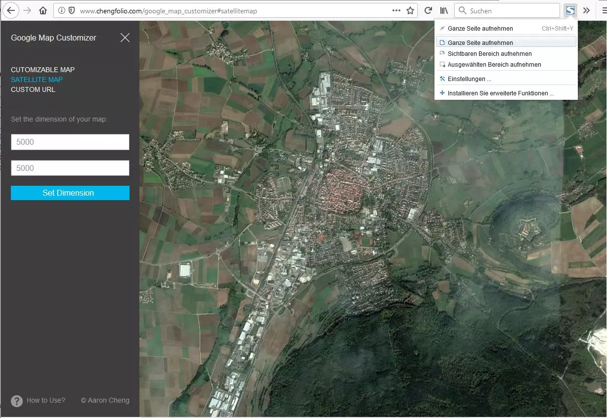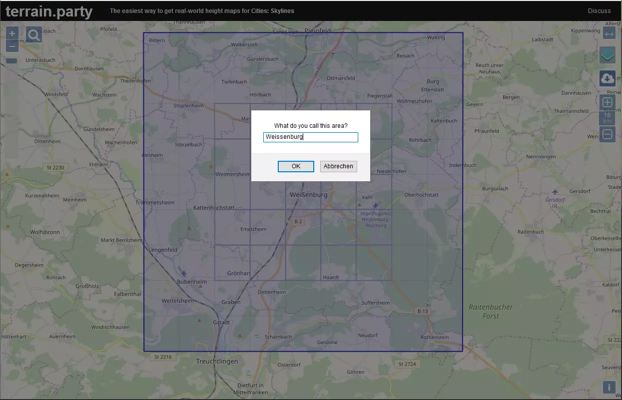 重要说明 调整导出区域时,你会看到中央的25个区块被突出显示。这是在未安装模组的游戏中,玩家可以购买区块的区域。该区域外的区块存在一些限制,尤其是最外侧的区块,其外边缘会出现一些雾效,隧道也无法正确渲染,还会有类似的故障。尽量将你的城市或城镇规划在中央5x5的区域内……但由于你可能会使用81区块模组,至少要尽量保持在7x7的范围内。 另外,你之后会注意到,游戏中的道路比现实中的典型道路要宽,至少在中欧是这样。为了避免在市中心(尤其是老城区)的道路上浪费过多空间,建议导出一个比实际比例稍大的地形模型。我选择了一块16x16公里的区域来对应游戏中约17.2x17.2公里的区域,这样我就有了一些额外的空间。如果你想模拟一个大城市,并且只关注大致的城市布局(而非比例),你可以自由选择任何尺寸。但不要期望在这样的布局中容纳真实数量的建筑物。 在欧洲,你很可能会在你的数据档案中找到【ASTER 30m】、【SRTM3 v4.1】和【SRTM30 Plus】的高程数据(此处按分辨率从高到低列出)。尽管你可能会因为【ASTER】数据看起来更详细而想要使用它,但我发现该数据在细节上并不可靠。特别是在平坦区域,它也包含许多高达10米的、现实中并不存在的凸起和凹陷。森林和大型建筑物可能会出现在这种高度图中——这并非我们所期望的。你可以稍后在地图编辑器中修正所有这些问题,但这是一项繁琐的手动工作。你或许更适合使用更平滑的SRTM3 v4.1数据。它可能缺少一些细节,但能为你节省大量时间。而且对于《城市:天际线》来说,平滑的地形无论如何都更好。 压缩包中包含一个自述文件,如果你感兴趣,可以了解更多关于数据源的信息。请注意,高度图以“普通”PNG文件的形式提供,可在任何图像查看器中查看。 注意:默认情况下,如果你导入此地形,中午时太阳会在北方。要解决此问题,请将图像旋转180度! 获取叠加图像 为了在地图上正确放置树木、道路、建筑物等,我们还需要一些视觉参考。有些模组可以将图片叠加到地图上。无论你使用哪款模组,首先都需要准备好图片。图片的覆盖范围应大致与高程模型相同。 获取此类图片最简单的方法是通过其他网站,即谷歌地图定制器,配合一款能截取超出显示范围网页完整截图的浏览器插件。 以下是具体步骤: 1. 安装一款能保存整个网页截图的浏览器插件。对于Mozilla Firefox和Chrome浏览器,“Fireshot”插件效果不错,其他常见桌面浏览器也有类似插件。 2. 打开谷歌地图定制器网页。 3. 首先确定你要导出的是地图还是卫星照片。前者为你提供更结构化但有限的信息,这些信息可根据你的需求进行自定义;而后者会显示所有内容(从植被、街道到建筑物),没有任何概括,但对于不熟练的人来说可能更难“读懂”。我个人更喜欢使用正射影像图。使用左上角的按钮可在两者之间切换。 导航到你的城市。由于没有搜索功能,最简单的方法还是缩小地图(滚动鼠标滚轮),然后拖动地图以显示所需区域,再放大到你的城市。如果使用卫星地图,你必须熟悉你所在区域的俯视图,才能从太空中找到你的城镇。 一旦你的城镇位于中心位置,设置你想要的覆盖图像大小。我使用了一张5500x5500像素的图片,但这取决于图像处理软件和你的电脑性能。像【OverLayer v2】这样的模组可以处理超大图片,但加载此类图片可能需要几秒钟(真的只有几秒钟!),而且你需要提前准备好图片。不妨试试看。 当你点击“设置尺寸”后,网页会变得非常大,你必须使用滚动条来平移浏览。现在要确保网页区域大致覆盖与你的高程模型相同的区域。 完成后,关闭所有侧边栏并截取全屏截图。平移和拼接完成后,插件会允许你将创建的完整截图下载为图片文件(PNG格式)。 使用图像处理软件制作半透明的PNG版本,即设置为50%透明度(或类似数值)。一种方法是导入图像,创建一个大小相同的全新完全透明图像,将图像图层粘贴进去,并将其图层不透明度/透明度设置为50%。如有必要,将此图像旋转180°以适应地形!