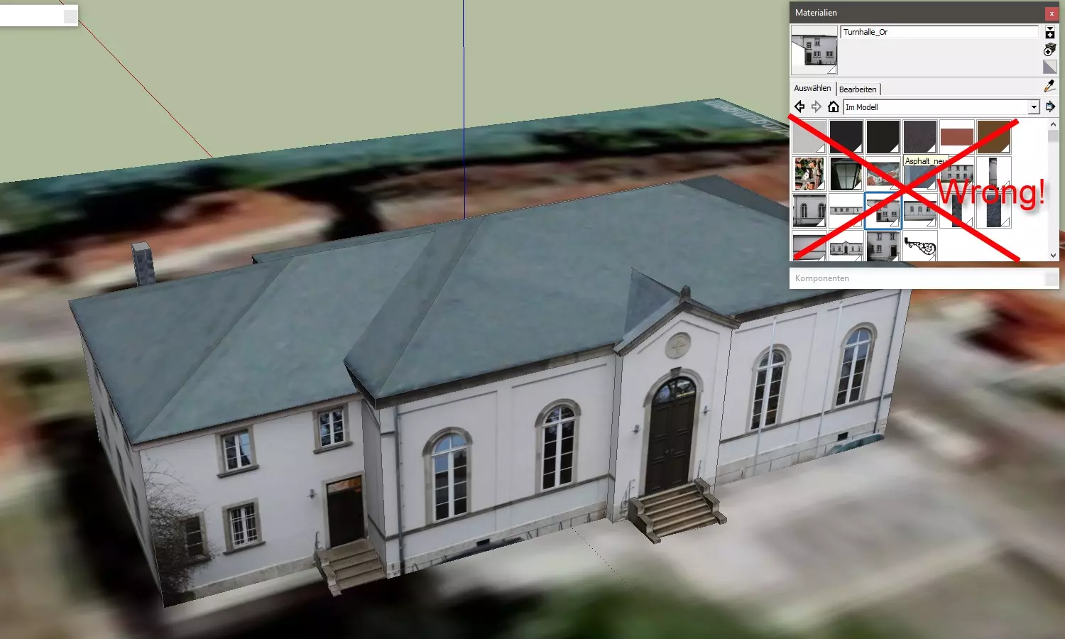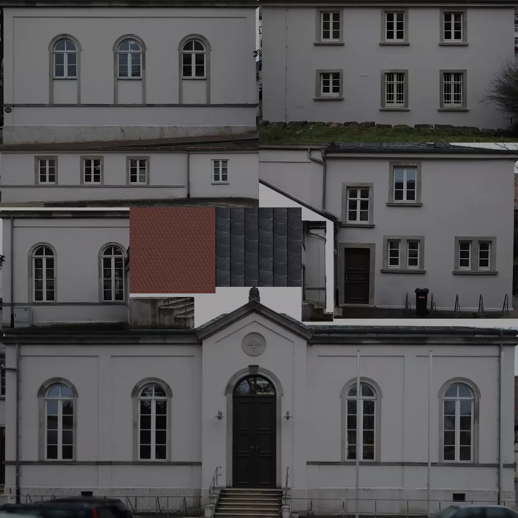我通常会先重建主要道路网络,从连接城市与郊区或周边村镇的大型道路开始,然后再添加更细致的小型道路。关于道路网络的技巧可以查看我的相关部分。重建真实城市并没有太多特别需要解释的地方,除了你需要根据地图覆盖层上显示的位置来规划道路,而且通常会比普通游戏中使用更多种类的道路(如果适用的话,还包括电车轨道和火车轨道)。 哦,如果你还没有这样做,或许可以给道路起上它们在现实世界中的名称,并调整路线使其与现实中的路线相符。在《城市:天际线》中,当你开始在市中心规划道路时,可能会发现游戏内道路看起来比现实中更宽——事实确实如此。以下是一些例子: 街道类型 | 基础游戏宽度 | 现实宽度¹ | 最接近的匹配项 ---|---|---|--- 单向单车道带停车及人行道 | 16米² | ~8米 | 8米,来自“Network Ext. 2”的“单车道单向带停车” 双向1+1车道无停车带人行道 | 16米 | 9-12米 | 8米,来自“Network Ext.”的“双车道小巷”双向,1+1车道,两侧有停车区,带人行道 16米 12-16米 16米,基础游戏中的【双车道道路】 双向,2+1车道,非对称,带人行道 16米 ~14米 16米,【大众运输】DLC(或【Network Ext. 2】)中的【非对称三车道道路】 双向,2+2车道,无中央分隔带,无停车区,带人行道 32米(!) ~16米 16米,【Network Ext. 2】中的【小型四车道道路】 双向,2+2车道带中央分隔带,无停车区,无人行道 32米 22-26米 32米,基础游戏中的【带中央分隔带的四车道道路】 ¹ 根据德国城市测量。其他国家的数值可能有所不同。 ² 基础游戏中没有此类道路,最接近的是双车道单行道。在某些情况下,使用【Network Extensions 2】模组中的“小型重型道路”或“微型道路”可以规避这种差异;而在其他情况下,尤其是仅允许单侧停车的道路,你将不得不使用现有的较宽道路。这就是为什么我建议在创建高程模型时略微放大比例,例如只使用16x16公里的地图区域,而不是真实比例地图所需的约17x17公里。 是否建造自定义建筑 没有真实建筑的“真实”城市会怎样?其标志性会大打折扣,不是吗?但创建自定义建筑是一项耗时的任务。一个普通的简单建筑从零开始制作通常需要花费数小时。即使你已有现成的建筑模型,正确的重新纹理化也可能需要数小时。这绝非玩笑!最终的决定权在你:你可以只使用【原版建筑】(或来自扩展包的建筑以及创意工坊中外观相似的建筑)。如果运气好的话,可能已经有人建造了你所在城市的一些独特建筑——或者至少是类似的建筑。但即便你打算自己创建自定义建筑,也不要尝试单独建模城镇中的每一栋房屋,除非你打算为你的城市聘请一整个建模公司。 只需专注于【地标建筑】(市政厅、火车站、教堂、剧院、塔楼、学校等,或许还有一些独特的市中心建筑),其余部分用原版建筑填充即可。如果你拥有【强烈推荐】的“European Suburbs”扩展包,那么这些建筑将非常适合许多中欧的郊区和村庄。建筑主题【柏林风格建筑】为市中心建筑提供了极具真实感的资产。若涉及苏联地区的大型街区建筑,有包含【苏联风格】建筑的合集,这类建筑通常是高层建筑或4-6层的大型街区建筑。 你很可能需要至少创建一些自定义建筑。本教程旨在教你一种尽可能简单的方法,只需使用免费软件即可实现。 我硬盘里正好有一百多座德国魏森堡镇的建筑模型,这些模型是十年前谷歌积极邀请建模师为谷歌地球创建建筑时制作的。因此,我的目标是将这些现成的建筑模型导入《城市:天际线》中。不出所料,由于以下几个原因,这个过程并不简单:《城市:天际线》不支持SketchUp文件,而且我的旧版SU8没有兼容的FBX导出器。(新版的SketchUp Pro有这个功能,但价格不菲。)最后但同样重要的是,《城市:天际线》对模型的要求与谷歌不同:你需要考虑单元格大小,还得留意夜景灯光、反射效果等细节。 本节将介绍如何调整和转换用谷歌/天宝SketchUp创建的现有建筑,使其能在《城市:天际线》中使用。这并非谷歌SketchUp的完整指南——关于这款简单CAD软件的使用方法,已有相关指南和视频教程可供参考。但在我看来,SketchUp是完成这项工作最简单且用户友好的工具之一。创建一个非常简单的房屋模型只需几分钟。而且,它具备创建复杂中世纪建筑的工具,即使是几乎没有直角的建筑也能制作。 接下来的章节中,我将介绍以下必要步骤: 1. 准备建筑纹理 2. 创建建筑模型(在SketchUp中) 3. 为模型添加纹理(在SketchUp中) 4. 使用Blender(开源软件)以最简单的方式将模型转换为所需的.fbx文件在《城市:天际线》中导入并配置建筑 自定义建筑1 - 基础纹理 要让建筑能在《城市:天际线》中使用,你只需拥有一个纹理——更准确地说,是一组带有不同后缀的纹理,我们稍后会详细介绍。与为谷歌地球创建的模型相比,这是一个很大的差异和限制,因为在谷歌地球的模型中,你可以使用任意数量的自定义和内置纹理。这不仅意味着如果你有这样的现有建筑,就必须对其进行完全重新纹理化,还意味着你必须创建一个包含所有即将用于不同面的小纹理和照片的初始图像。通常,它看起来会有点像拼图。