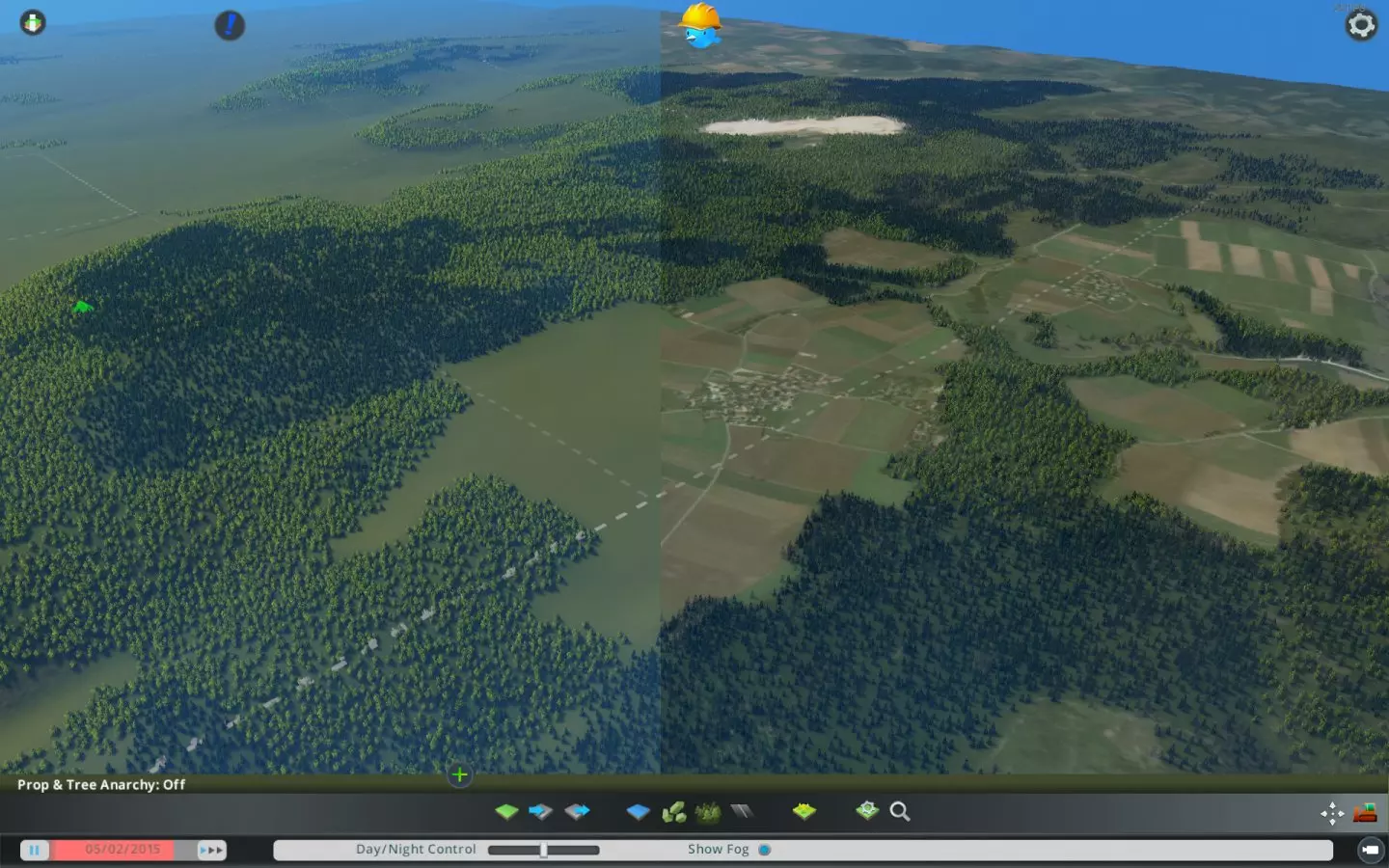 在这个阶段,我通常只使用少数树种——山毛榉(在德国非常常见)和小型针叶树,有时会混合一些大型针叶树,让森林看起来更自然。不过你可以自由种植任何在你的城市里能生长的树木。(仓库提供了几十种额外的树种供选择。) 顺便说一下,在上面的截图中,你可以看到推荐的【No Tree Brush Slope Limit】模组的效果——我可以在这个斜坡上种植森林,否则这里或多或少会保持光秃秃的状态。 小贴士:打开谷歌地图、谷歌地球或类似工具查看高分辨率的地形会非常有帮助。谷歌地球甚至提供按时间戳选择图像的功能,这样你或许能找到更旧或更新的图像,这比默认图像更容易区分森林类型。很快,你的地形可能会变成这样(右侧带有叠加层):