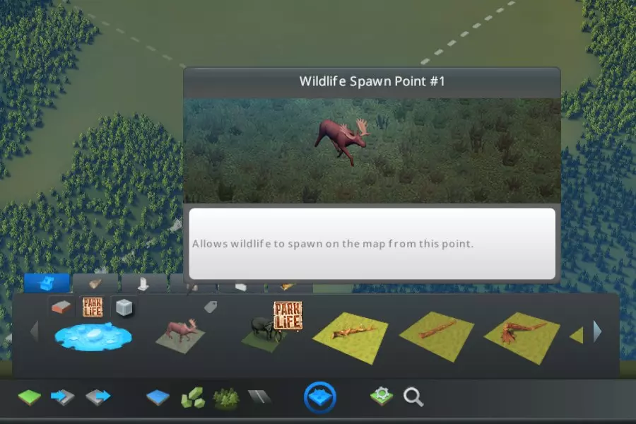 是时候将一些动物放归野外了:工具栏中的【环境】按钮可让你放置某些森林动物(或者如果你喜欢的话,也可以是外来动物)的生成点。如果模拟区域内存在野生动物,你可能需要设置一个或几个生成点。