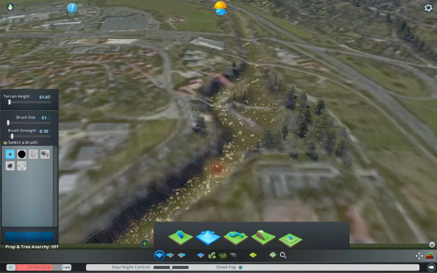 如果你的地图区域内有一条较大的河流(或多条河流),那非常好,因为它能提供所需的流动水源。需要注意的是,你无法合理地创建宽度小于3-4格的河流,即大约30米宽。如果你想模拟穿过村庄的小溪流,或者像德国奥格斯堡这类城市中的小河道,那可能无法实现,对此我们深表歉意。 你可以使用【平整】工具来挖掘河道。如果你不熟悉这个工具,操作方法是:先用鼠标右键选择一个高度,然后用左键就能在地图上绘制出这个高度的区域。由于河床通常是平坦的(山地河流除外),所以我认为这个工具非常适用。可以使用如下截图中的笔刷设置(笔刷强度0.10) 你可以挖掘一条相对狭窄的沟渠——正如我所说,3-4格是后续获得有效水流的最小宽度。同样,【覆盖层】能极大帮助你准确了解河流的位置。我建议将河床至少挖深约8米。否则,很难在不淹没周边区域的情况下确保水流正常。