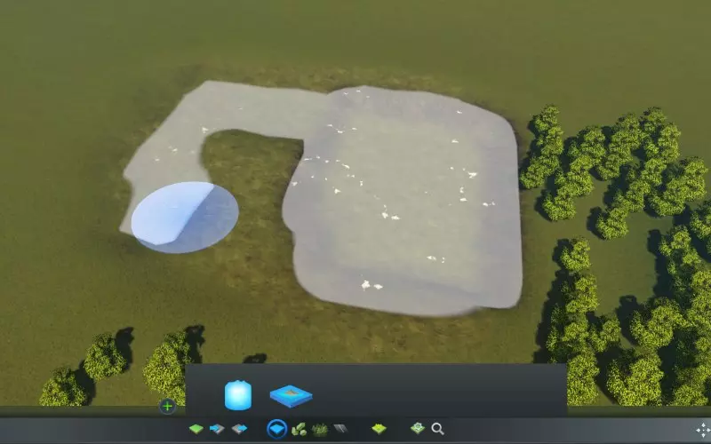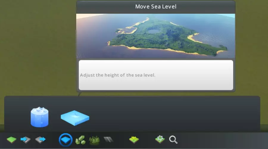 创建河流与水体 地图发布的要求之一是起始区域需有流动的水。因此,现在是时候让水流起来了。如果你尚未选择起始区域,现在就该决定:我将在地图的哪个位置创建至少一条道路连接和流动的水? 如果你的城市位于岸边,应首先使用工具栏【水】部分中的【提高海平面】工具,将海平面调整到与地形看起来自然协调的高度。
