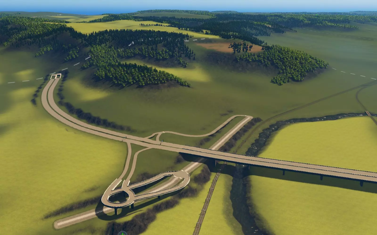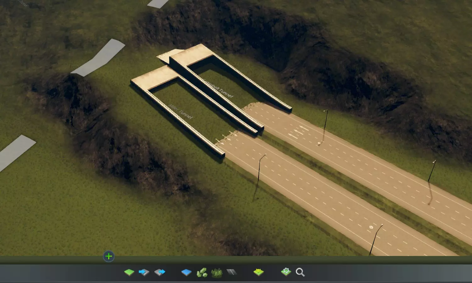 你可以在那里创建一条人造河流,由一个小型水源、几米长的“河道”以及一个用作排水的蓄水池组成(水会在那里渗透掉)。将所有这些都放置在明显低于周围地形的高度。根据你在不淹没周边区域的情况下引流出的水量,之后你可以在游戏中用这个水源为城市的一部分供水……当然,它也可能毫无用处——除了能满足地图编辑器的需求之外。 顺便说一下:目前还不能在你的河流和湖泊中生成鱼类。这不是一款钓鱼模拟器。 创建基本的道路和铁路连接 创建外部道路和铁路连接相当简单,与在游戏中建造道路和铁路没有区别。默认情况下,只有少数高速公路和国道可用。如果你想使用地图编辑器中已有的其他道路,则需要【更多路网扩展】模组。尽管在普通地图中,通常只有高速公路作为地图的出入口,但实际上你也可以用较小的道路创建外部连接,例如双车道“国道”。因此,即使你的城市区域内没有高速公路,也无需担心。 如果地图要在无模组的情况下可玩,必须至少有一条从地图边界到“起始区块”(即新游戏中玩家最初可见的区块)的道路连接。 请注意,道路在地图编辑器中显示为简化版本,在游戏中它们会看起来更美观。另请注意,默认情况下,您无法在地图编辑器中建造隧道(与立交桥不同),但【地图编辑器隧道启用器】模组可解决此问题。地图编辑器中的隧道入口外观也经过简化。