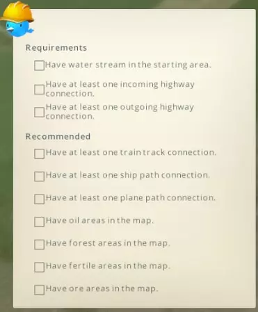 关于立交桥的几点提示: 1. 若要让一条道路(或火车轨道)通过桥梁跨越另一条,两条路线之间至少需要10米的高度差。你可以在地形工具中轻松查看高度,使用【平整地形】工具并右键点击某个位置,即可“测量”该点当前的游戏高度。 2. 游戏中无法创建现实中存在的窄型立交桥(宽度小于约30米),因为游戏不支持垂直斜坡或小型隧道。你可以通过以下方法解决:先建造较宽的立交桥,之后在游戏中使用诸如码头、石头或墙壁等资产,将斜坡隐藏在一些人造“地形”后面。另请注意,无法将【Network Extensions 2】模组中的“微型道路”用作桥梁——它们没有高架版本。 完成地图 现在你已在地图上放置了树木、水域、道路,可能还有火车、渡轮和飞机连接,几乎可以完成地图编辑器中的工作并进入实际游戏了。在保存最终地图之前,有几件事你可能需要做或检查,因为一旦使用此地图开始游戏,就无法再返回地图编辑器:是否满足最低要求?问问啾啾,它会显示检查清单。 如果你不打算将地图用于游戏,而只是为了重建真实城市,那么你可能不需要关心农田、矿石和石油等自然资源。不过,在现实中存在农田的地方放置一些农田也无妨。泛黄的农田区域可能会为你的地图增添些许变化,使其更具真实感——而且这样一来,日后就能在这些区域“发展”出农场,而不只是手动放置农场了。