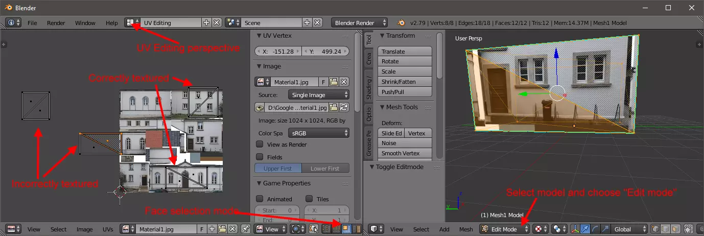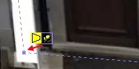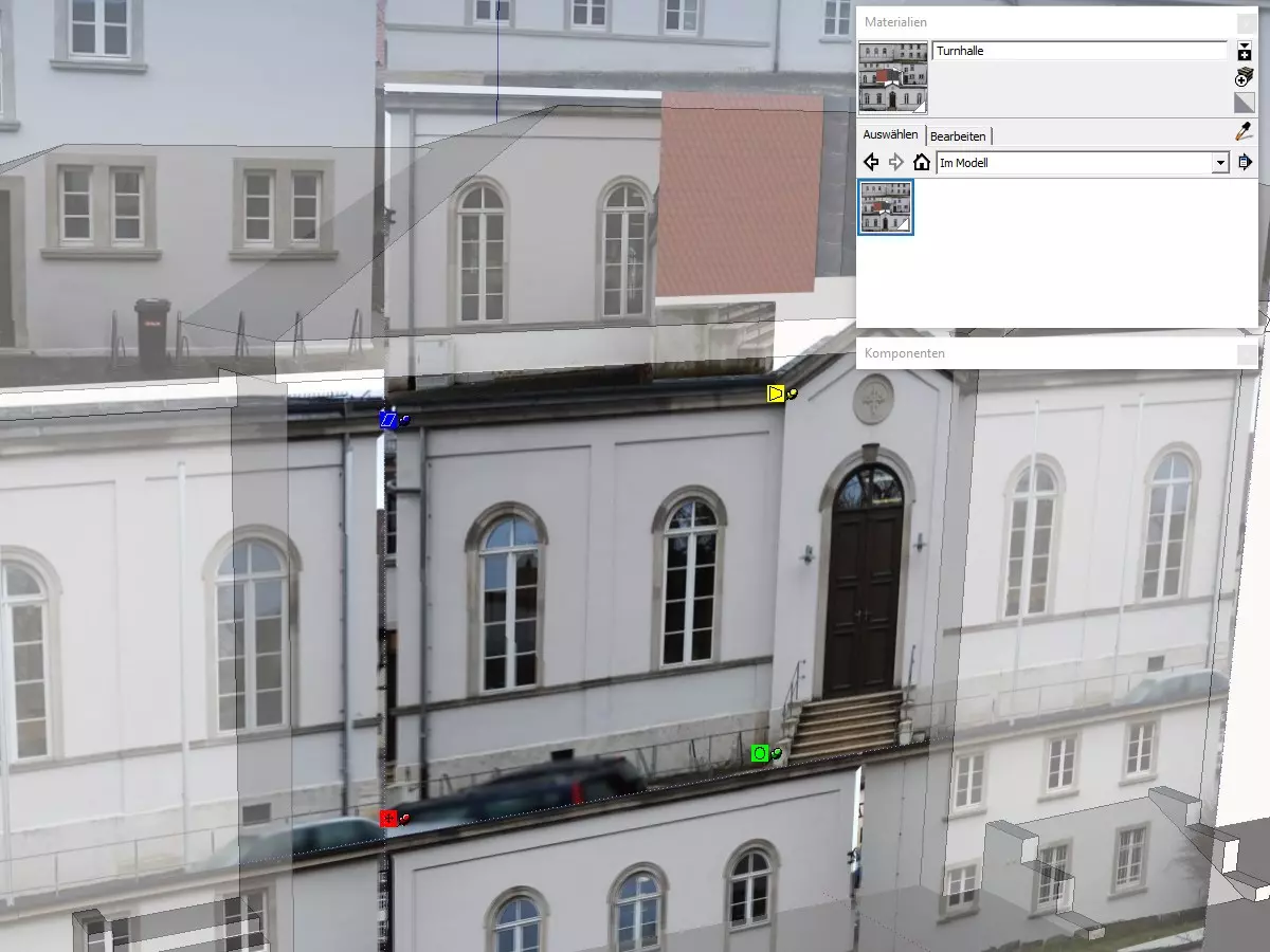 为避免这种情况,建议使用彩色定位点。只需将红色、绿色和蓝色定位点移动到它们实际的理想位置(调整大小、旋转、拉伸甚至切变都是可以的)。当移动黄色定位点时,会出现一个“吸附点”以及两条指向它的辅助线。将黄色定位点设置到这个吸附点上,即使这并非纹理位置的理想位置。这样做,模型导出时应该仍只使用一个纹理(但最好检查一下)。如果将第四个黄色定位点移动到SketchUp建议的点以外的任何位置,OBJ导出器将会为其创建一个单独的纹理文件。在这种情况下,你必须撤销操作步骤,直到回到只有一个纹理文件的状态。稍后你需要按照《新手指南》中描述的方法在Blender中微调这个特定的面。因此,最好也阅读该指南中关于Blender UV映射的章节。(注意:我不知道这个问题是否也适用于当前版本的SketchUp。) 现在,这个面应该会按预期显示: