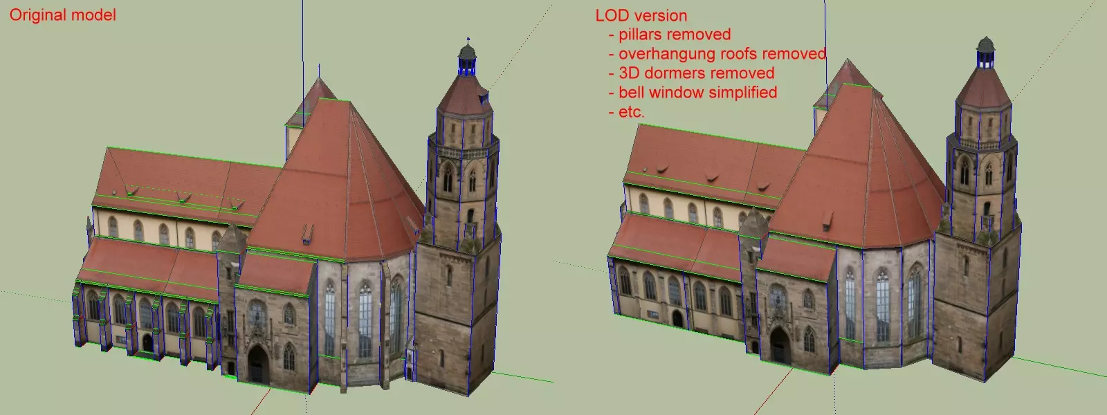 注意:你将从SketchUp获得一份导出摘要。如果摘要显示已导出多个“实例”,则说明你的模型包含必须先分解的组件。如果对话框列出多个纹理,这也是有问题的。检查创建的纹理子文件夹,找出导致OBJ导出产生多余独立纹理的面,将这些面的纹理替换为默认材质(白色),然后在Blender中为这些面添加纹理。你可能以“扭曲”的方式应用了纹理,而OBJ导出器不支持这种方式。 为方便起见,以下是我所知的完整禁止事项清单。忽略这些,你之后将无法导入模型: - OBJ导出后出现多个纹理 - 存在组件或组 - 存在任何未连接的面或面组(确保所有面都通过其他面而非仅通过线条连接到主模型。尤其要检查烟囱、老虎窗、前楼梯等部分。一个简单的检查方法是:点击模型,选择“选择”->“所有已连接项”,按下“删除”键,查看剩余内容……当然,之后要撤销操作。) 自定义建筑4 - 注意LOD 首先——什么是LOD? LOD即“细节层次”,在3D建模中通常指模型、纹理或两者的低分辨率版本。使用LOD版本意味着,当你从远处查看模型或纹理时,反正无法看清细节,加载这些细节就是浪费。在这种情况下使用简化版本可以节省内存、缩短加载时间并降低场景复杂度(对于模型而言)。