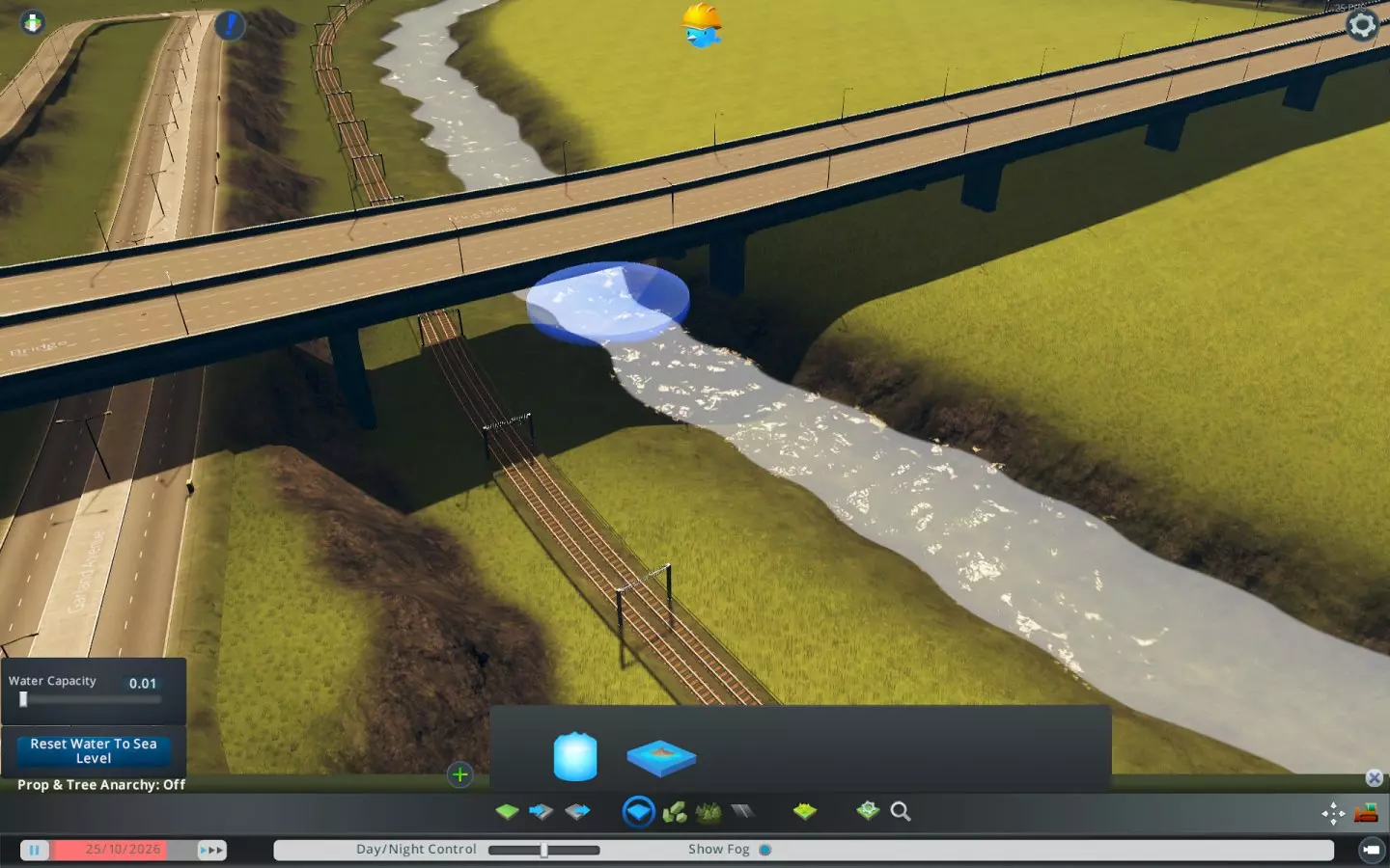 如果你的河流像上面截图中那样狭窄且水浅,那么初始时应将水量设置得非常低——0.01。当然,对于更深、更陡且更宽的河流,则需要更高的水流。你可以通过滑块调整水量,或者在对话框中输入具体数值。 现在取消暂停游戏,观察水流的变化情况。(你可以根据喜好加快游戏速度。)根据实际情况调整水源。 如果你拥有一条坡度不大的河流,你会发现,尽管水在朝着正确的方向流动,且水源在持续提供新的水,但越往下游,水流似乎变得越来越小。基本上,水好像以某种方式渗透流失了。实际上,这相当符合现实情况。如果你有一条没有支流沿途汇入更多水源的河流,那么这条河永远无法流入大海。 对此有两种解决办法,因为建造小支流并非可行选项。你可以选择增加水源的蓄水量,寄希望于这能让河流延伸得更远一些。但更好的方法是在沿河添加更多低容量的水源。沿着下游走,当你觉得河流看起来水量太少时,就在那里添加一个小型水源。在每个水源前略微抬高河床会有所帮助,这样水更有可能向下游流动。 小贴士:将额外的水源放置在桥下,这样它们就不那么显眼了。