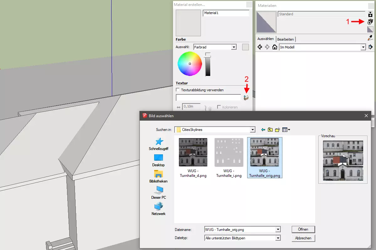 如果尚未打开材质窗口,请将其打开——你可以在菜单的“窗口”->“材质”中找到它。 在下拉菜单中切换至“模型中”视图(第一个选项)。如果你导入了现有模型,且在此部分看到多个纹理(就像我那些谷歌地球时代的旧SketchUp模型一样),请通过逐一选择并在右键菜单中选择“删除”来删除所有这些纹理。(当被询问是否使用默认材质时,选择“是”。) 使用“创建材质”按钮——右侧从上数第二个按钮——你可以导入原始纹理图像(不是减弱的漫反射纹理版本)。在“创建材质”对话框的“纹理”部分,使用右侧的按钮导入你的纹理图像。此处使用的图像不一定需要是之后导入《城市:天际线》的纹理的静音变体——只需使用“自定义建筑”章节第一部分中创建的纹理即可。你可以给材质起一个有用的名称,但并非必需,因为你只使用这一个。关闭“创建材质”对话框。此时“材质”对话框应显示你唯一的纹理。