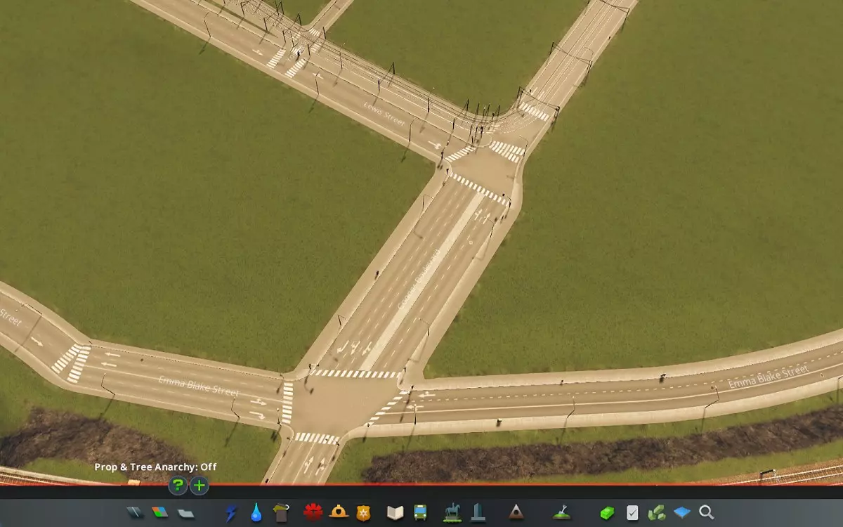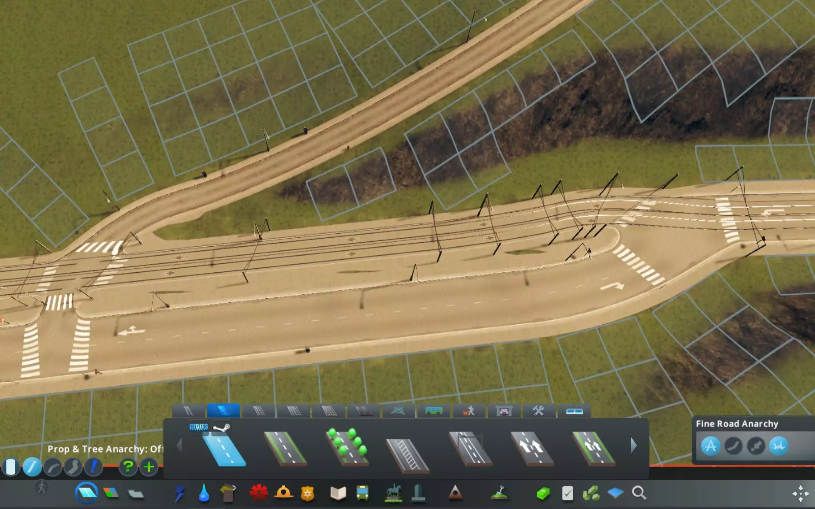 我还可以推荐一个名为【精细道路无政府状态】的模组。它能让你以原版游戏不支持的方式创建十字路口、放置道路以及火车/电车轨道——通常这么设计是有原因的。所以请谨慎使用这个模组!不过,若想创建更真实的高速公路交叉路口,它会非常有用,因为它允许以锐角连接两条道路(但如果角度过小,道路通常会显示得很不美观)。 你还可以用它创建更真实的交叉路口,比如电车从道路中央切换到道路侧边——这其实就是一个角度相当锐利的电车-道路交叉路口(见下方截图)。创建更真实的火车轨道道岔/交叉口时也是如此。通过禁用节点吸附功能(见下方截图),可让有轨电车轨道紧邻街道铺设。允许创建极短的道路路段,从而能在现有节点附近进行道路分支。不过,过度使用此功能可能会产生不良效果,例如人行道交叉和路缘角重叠,导致街道外观显得有些怪异。