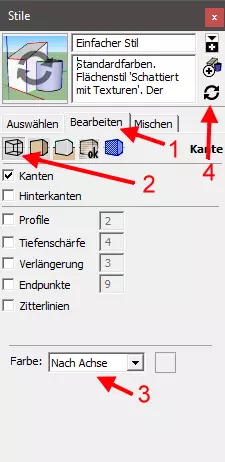 打开样式窗口并查看当前样式。我推荐一种样式,即与坐标系轴线平行的线条会获得相应的颜色(红、绿、蓝),这有助于判断线条是否真的平行于某一轴线,而非仅仅看起来平行。你可以通过以下步骤实现:例如选择【基础样式】,切换到【编辑】选项卡(1),在选项卡下方选择线条设置(2),然后选择将线条“按轴线”着色(3)。完成后,使用更改后的设置更新样式(4)。现在你可以点击对话框的工具栏将其关闭或最小化。 对于我们的示例建筑,我们从一个6x4米的矩形底座开始。使用【矩形】工具。