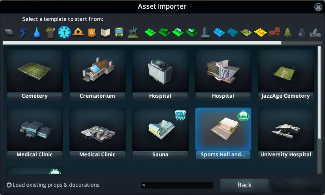 到目前为止,你至少应该有以下两到四个文件: <building>.fbx - 模型本身 <building>_d.png - 漫反射纹理,用于显示模型表面的外观,已根据游戏需求调整 <building>_i.png - 可选的发光纹理(夜间灯光) <building>_s.png - 可选的高光纹理(反射效果) 现在启动《城市:天际线》,在主菜单中选择“编辑器”->“资产编辑器”,然后点击下方的“新建”(右侧截图)。选择任意主题(例如欧洲主题)。我认为选择哪个主题并不重要,但我也不确定。 对于要创建的资产类型,选择“建筑”并点击“继续”。 接下来的对话框很重要,需要理解。你无需从头开始配置资产。你可以选择一个相似的资产,然后复制其设置,并可选择在之后修改(大部分)设置。在这里,你需要决定你的模型日后是“可放置的”独特建筑,还是可生长建筑(例如低密度住宅),或是公共服务建筑,如消防站或学校。因此,务必选择最适合你模型的模板。你之后无法更改此模板(或其相关属性)!所以要确保你不会将消防站创建为办公楼之类的情况。 提示:如果你创建了一个转角建筑,你需要另一个转角建筑作为模板。或者,你需要使用【ModTools】(如[cslmodding.info]中所述)来在之后更改分区模式。在我的示例中,我创建了一个健身房模型,因此我选择【医疗】选项卡,并选择【体育馆及……】建筑作为模板。