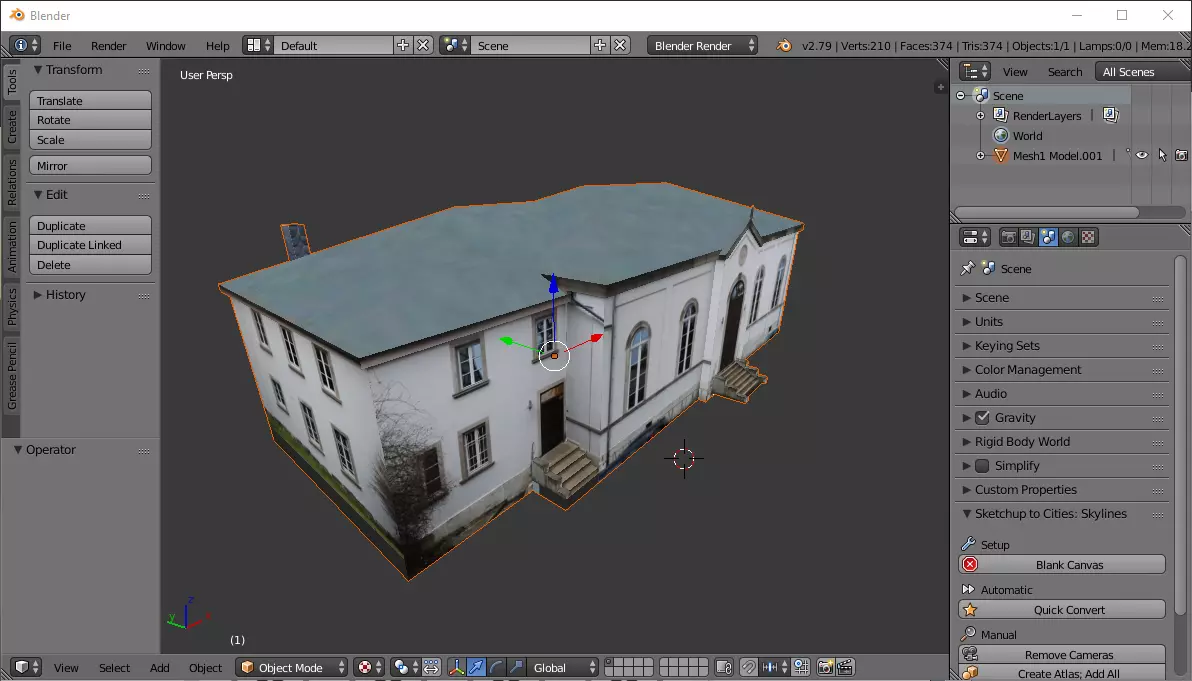 当我将一个现有的SketchUp模型加载到Blender中并检查其中的UV坐标时,我发现只有约30%的UV坐标位于纹理上(在正确范围内),50%在纹理左侧,20%在纹理右侧或其他位置,有些甚至偏离得更远。 你有两种方法来纠正这个问题:一是直接在Blender中操作(如果你熟悉UV编辑模式的话。遗憾的是,我并不熟悉。);二是在SketchUp中,检查每个面当前的纹理位置,然后在SketchUp中相应地移动纹理,从SketchUp重新导出,再导入Blender并再次验证,重复此过程,直到至少所有较大的面都没问题。这可能会令人沮丧,这就是我不推荐使用SketchUp来完成这项任务的原因。如果你有一些经验,或许能猜到一开始在SU中应该把纹理放在哪里,但经过快速测试后,到目前为止我仍然无法提供任何有用的规则。 自定义建筑5 - 使用Blender进行模型转换 如果你因为没有SketchUp Pro许可证而无法使用Cities Skylines Tools,那么你必须按照本章内容将.obj文件转换为所需的.fbx格式。 启动Blender(我使用的是Blender 2.79)。输入“b”并拖动鼠标框选场景中的立方体和灯光。按“Del”键删除它们。 然后选择“文件”->“导入”->“Wavefront(.obj)”(或者在文件菜单中,按“i”“w”),导航到包含的文件夹。将obj文件或文件夹粘贴到上方文本框中。提示:通过左侧边栏的“添加书签”选项将文件夹添加到“书签”中,以便下次更轻松地找到。选择并点击“导入”(或按回车键)以导入模型。现在你应该能看到模型,可能需要稍微缩小视图。很可能看不到任何纹理。要更改此设置,请使用底部栏中“对象模式”右侧的视图模式选项——如果显示白点,在下拉菜单中选择“纹理”。