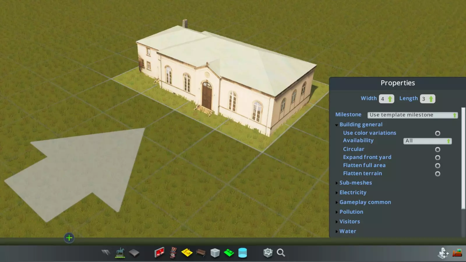 .fbx文件格式不符合要求。网上有相关信息,简而言之:不能直接使用SketchUp Pro导出的.fbx文件。对于SketchUp Pro 2015或更新版本,有一个插件可以将文件修改为【城市:天际线】所需的格式;对于旧版本,则需要使用Blender进行转换。 模型包含多个网格。在为谷歌地球建模时,我曾使用一个技巧:将一个小矩形放在一个大矩形前方几厘米处,以降低多边形数量(右侧示例),但【城市:天际线】无法处理这种情况。其他例子可能包括烟囱、屋顶窗或楼梯未通过面与模型其他部分连接。(有关如何判断哪些模型部分可能导致问题,请参见Blender相关章节。)使用某些模板时,你的模型可能会呈现出明显的偏色,例如偏红或偏蓝。这是由于模板中使用的颜色变化导致的。要“修复”此问题,请打开建筑设置对话框底部的【材质】部分,点击任意【颜色变化】颜色并将其设置为白色。预览模型将反映此更改并显示其正常颜色。 自定义建筑8 - 配置资产 首先要做的是调整宽度和长度(以单元格为单位)。如果你在上一步中设置的比例有误,现在就会发现建筑没有占据预期的单元格矩形区域。