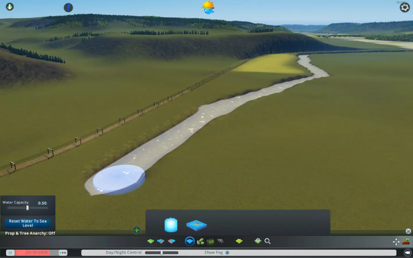 河流必须有一定的坡度,否则水流很难知道该往哪个方向流动。确保河床至少每公里降低一米左右——当然,如果你的河流实际坡度更大,事情就会更简单。 为了确保河流不会反向流出地图,你可以在河道到达上游一侧的地图边界之前停止挖掘。这就是放置第一个水源的位置。我建议在此操作时暂停游戏,以避免在调整水源之前淹没你的区域。