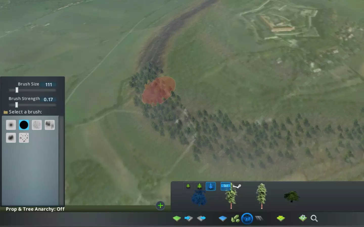 接下来的步骤是满足基本的地图要求——而啾啾会很乐意向你展示你的进度。你可以按任意顺序在地图上放置树木/植被、水源、道路(以及可能的铁路/航运/航空路线)、资源和其他所有元素。只需确保覆盖所有内容即可。 创建森林和水源 创建森林:你可以现在创建森林,也可以在游戏后期再创建,但除非使用模组,否则地图编辑器中拥有更适合创建森林的工具。 放置森林时,强烈建议使用卫星照片作为叠加层。如果你足够幸运,这张照片是在非植被生长时期(冬季或春季)拍摄的,你就能轻松区分针叶林和阔叶林。在冬季,针叶林呈绿色,而阔叶林呈灰色。到了春季,针叶林通常比长出鲜嫩浅绿色新叶的阔叶林颜色更深。至少在中欧地区是这样的情况…… 使用树木笔刷可以在大片区域种植单一树种。你可以花时间尝试不同的笔刷设置,通常笔刷强度设为0.20左右时,大小在50-100之间效果较好;而笔刷强度设为0.10左右时,大小在200及以上效果更佳。(这是因为笔刷尺寸越大,树木密度似乎也会随之增加。)