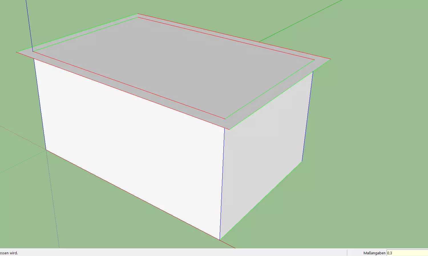 通过拖动已高亮显示的面将其向上拉伸成一个方块。释放鼠标后,输入“3”将高度设置为3.0米。若要为建筑添加山墙,请使用【偏移】工具。