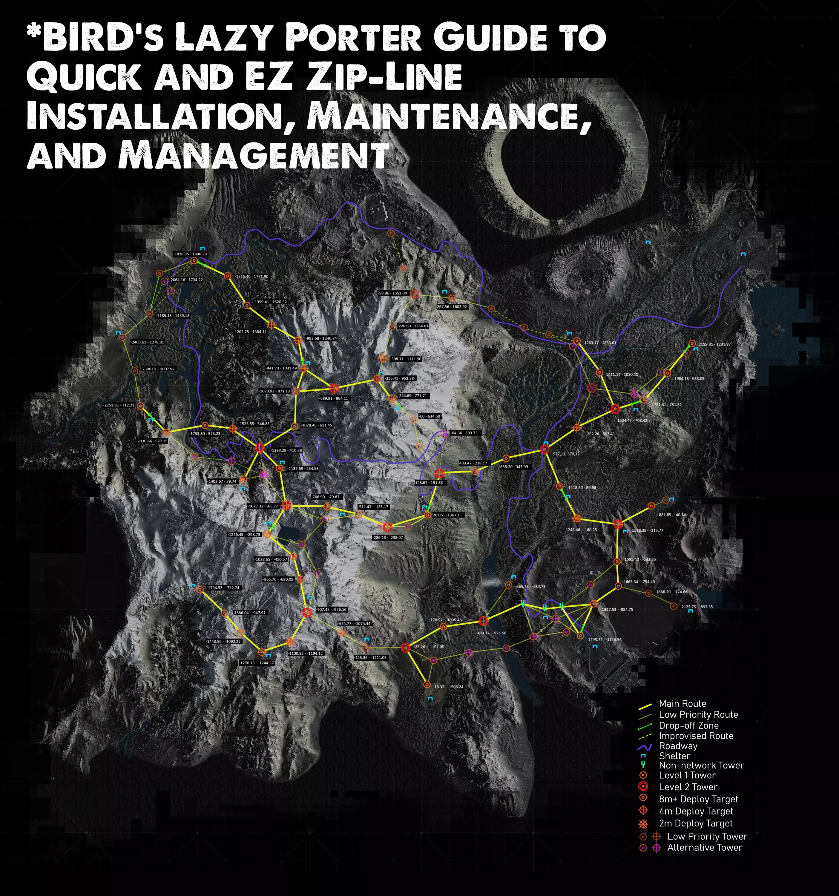 本指南提供了“飞鸟指南”中名为“懒汉搬运工快速简易滑索安装、维护与管理指南”的“中央”部分的地图、坐标和一组截图。 警告 - 前方剧透 请注意 - 以下信息会透露收藏家的名称和位置。 致各位搬运工伙伴 我要感谢飞鸟先生和Vampair先生,以及所有搬运工伙伴,感谢他们花费时间制作的指南、视频、截图和在线建筑,这些在我扮演山姆的旅途中给予了我极大的帮助。 我真诚地希望,如果我们采用通用的“主路线”定位,就能更有效地帮助新玩家使用滑索。为此,我在飞鸟先生精彩指南的基础上,呈上自己的成果——地图上“主路线”的坐标。此外,我分享了关于索道位置的截图,并在每张截图中以纯文本形式标注了坐标。 带坐标的地图(中部地区) 我已在地图上标记的每个“主要路线”塔台添加了坐标。 你需要放大才能看到数字。 坐标格式为“XXX - YYY”。如果XXX和/或YYY为负数,则格式将显示为“-XXX - -YYY”。