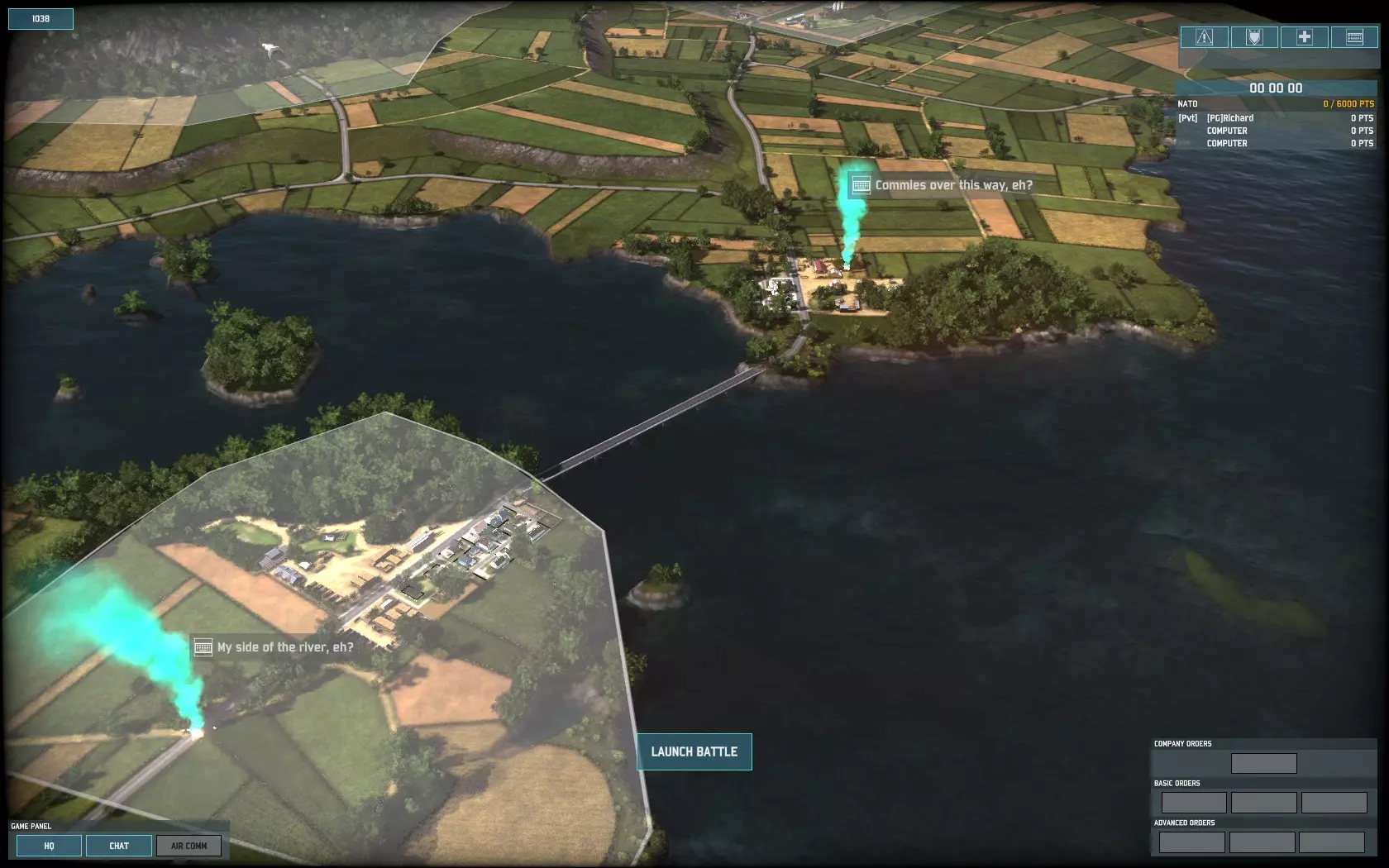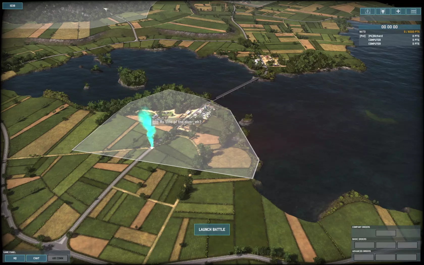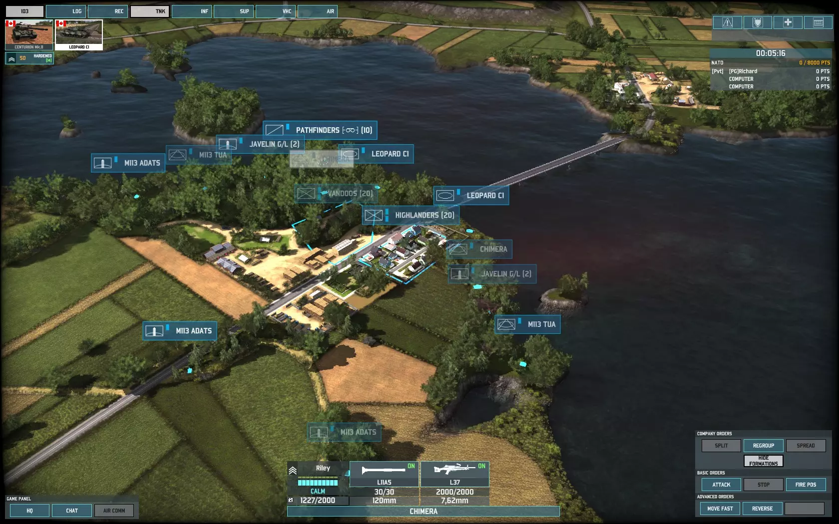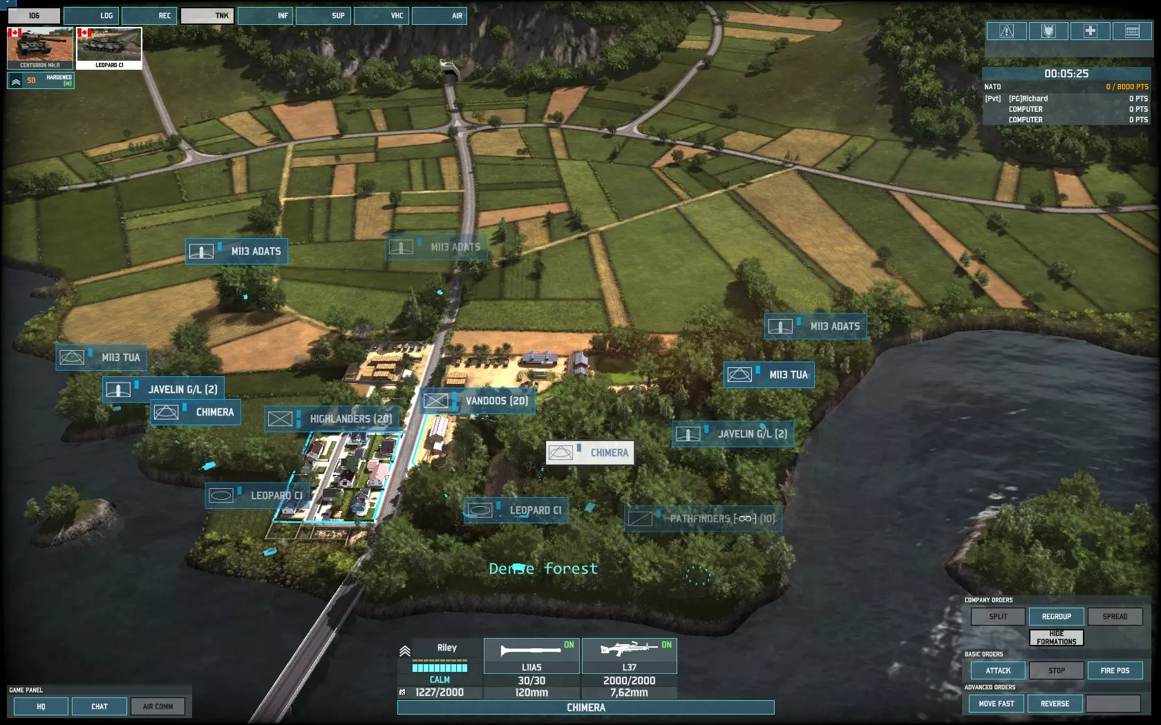 游戏开始时,我会派遣一队【高地人】步兵乘坐直升机,抢占我方河岸的建筑物。如果敌人试图通过桥梁 rush 坦克,他们将会遭遇一个不愉快的惊喜。 其次,我会调动剩余的部队。这支部队由【奇美拉】装甲车、侦察步兵、【阿达茨】防空导弹系统、【范杜】步兵、【标枪】防空步兵、【陶式】反坦克导弹、【改进型陶式】反坦克导弹以及充当肉盾的【豹1】主战坦克组成。(这点非常重要!【豹1】坦克拥有不错的11点装甲值。当敌人向你发起 rush 时,它们能承受大量伤害,并且射速比【奇美拉】更快。在你的重型装备抵达并开始攻击前,它们会成为敌人的巨大干扰。只要有可能,就把【豹1】部署在【奇美拉】正前方。) 这就是我防御部队的最终配置: