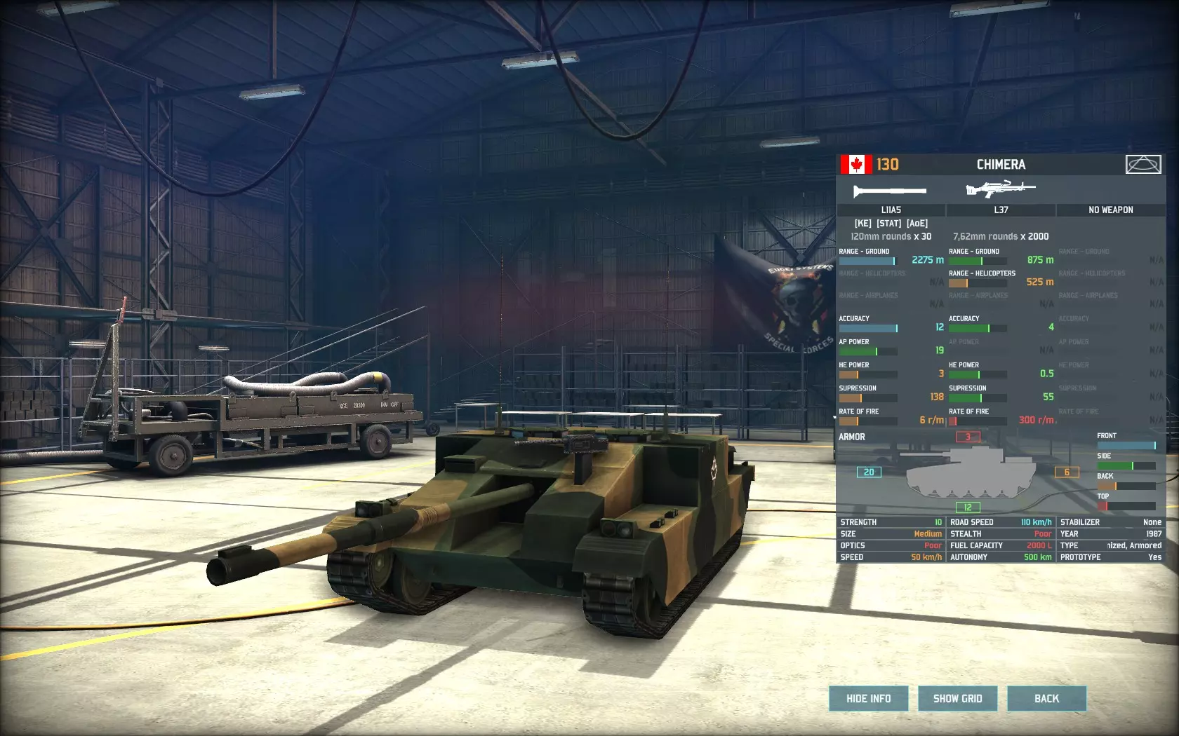 你们中有些人可能还记得《坦克世界》里的“乌龟坦克”。 这是北约军队中装甲最厚重的载具,也是你攻防战中最重要的载具。正如我之前所说,加拿大没有任何重型“坦克”。但奇美拉不是坦克,根据游戏设定,它是坦克歼击车,而且完全配得上这个 designation。除了T-80U,其他任何载具在面对它时都会感到畏惧。它拥有20点正面装甲,主炮基础命中率为60%,基础穿甲威力为19点。 诚然,它的射速只有每分钟6发,这使得它在面对敌方冲锋时较为脆弱。但在对抗少量重型坦克或更小型目标时,这或许是北约最适合执行此任务的坦克。奇美拉的主炮能够对游戏中除T-80U之外的任何华约坦克造成伤害,而其厚重的正面装甲意味着几乎所有华约坦克都必须机动到更近的距离才能对奇美拉造成伤害,因为大多数华约动能武器的穿甲值都低于18。凭借12的精度,再乘以【老练】等级的加成(这是奇美拉能达到的最低经验等级),主炮的命中率为75.6%,即每四发命中三发。相比之下,精英等级的T-80U命中率约为66.8%,即每三发命中两发。这一点至关重要,因为即便华约坦克射速更快,奇美拉坦克凭借更高的射击精度,最终也能使对方坦克陷入恐慌并将其摧毁,所以华约坦克的射速优势几乎无关紧要。