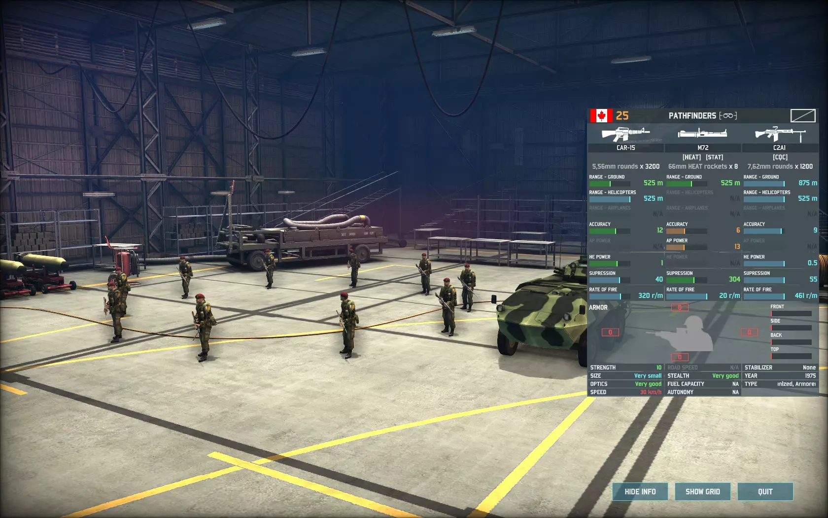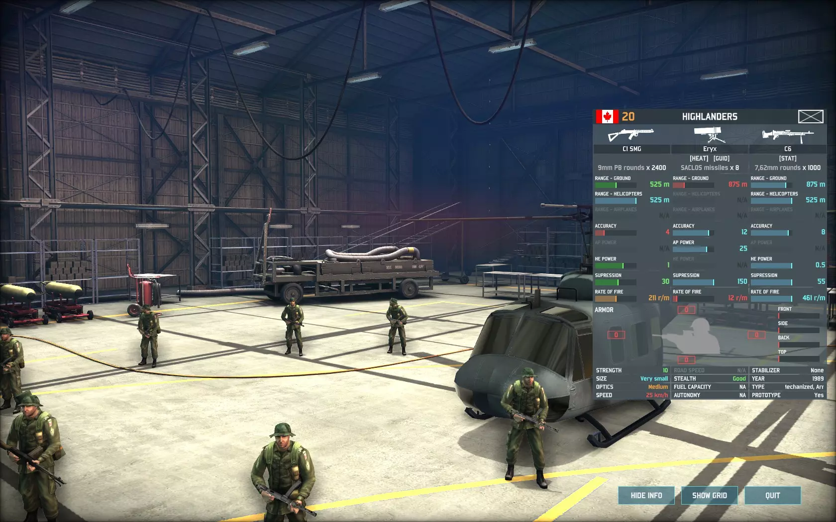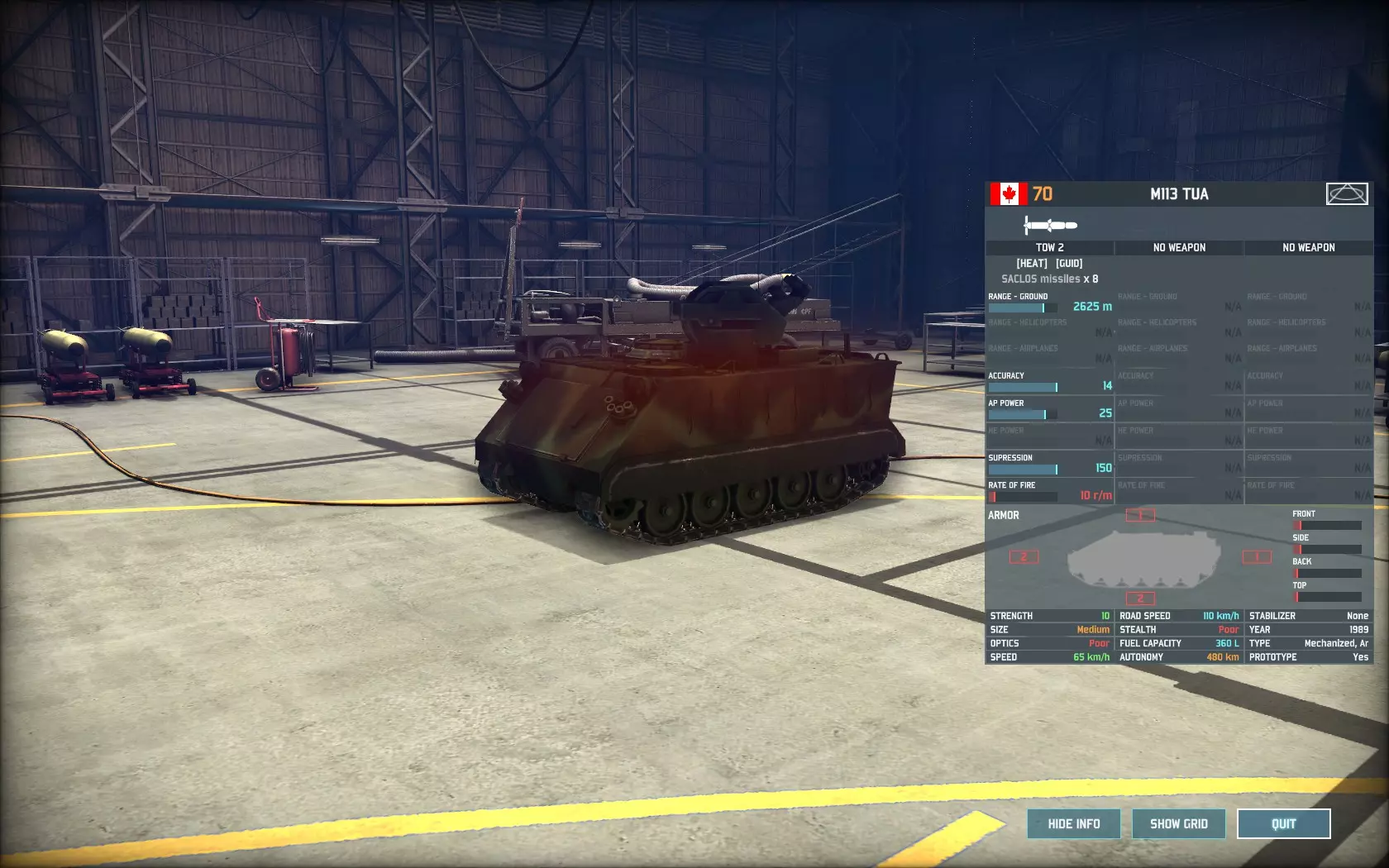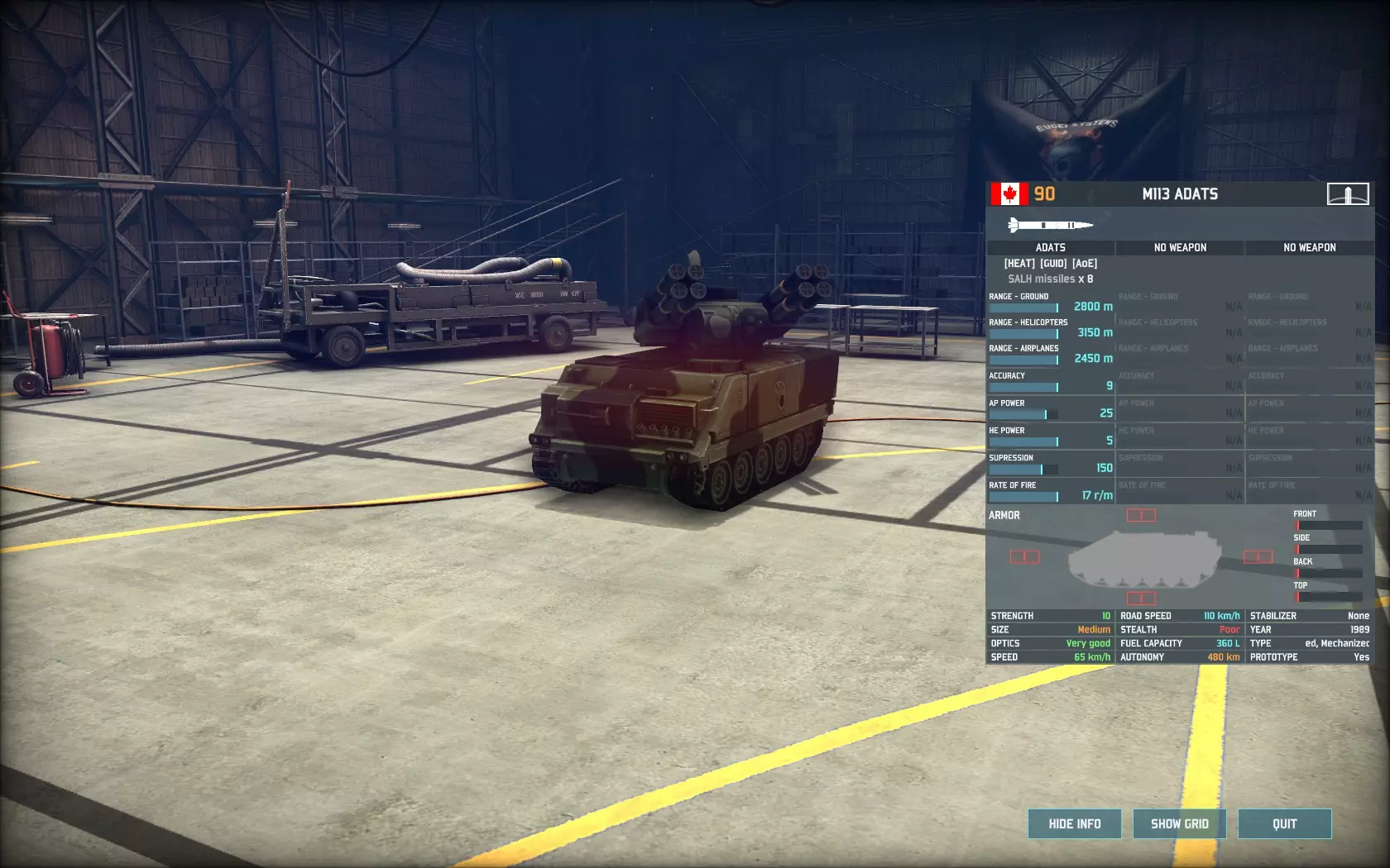 接下来是著名的防空反坦克系统原型,即ADATS。该单位几乎弥补了加拿大所有的防空缺陷,拥有9的精准度(45%基础命中率),对直升机的射程超过3100米,对喷气式飞机的射程为2450米,高爆弹威力为5。该单位不使用雷达,因此不会被防空压制武器锁定。 ADATS的另一个有趣特点是它能够攻击地面目标——它是《战争游戏:空地一体战》中唯一能同时对空和对地的导弹防空单位。它对地面目标的精准度仍为9,射程2800米,穿甲威力25,与ERYX反坦克导弹和陶式-2反坦克导弹相同。除非万不得已,否则不建议将该单位用于反坦克任务,因为它采用老旧的M113底盘,装甲防护薄弱。损失一辆这样的车辆就意味着失去一个非常宝贵(且稀缺)的防空单位。但当与陶式反坦克导弹发射车(TUA)和改进型陶式反坦克导弹(I-TOW)(此处未提及)协同作战时,它能将大量华约集团重型装甲部队的进攻路线变成死亡瓶颈。