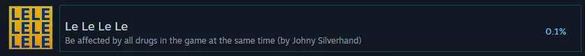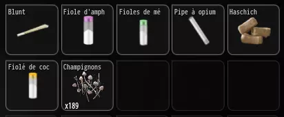 同时受到游戏中所有毒品的影响 你必须服用以下毒品: blunt/大麻烟卷 安非他命瓶 甲基苯丙胺瓶 鸦片烟枪 哈希什 可卡因瓶 毒蘑菇