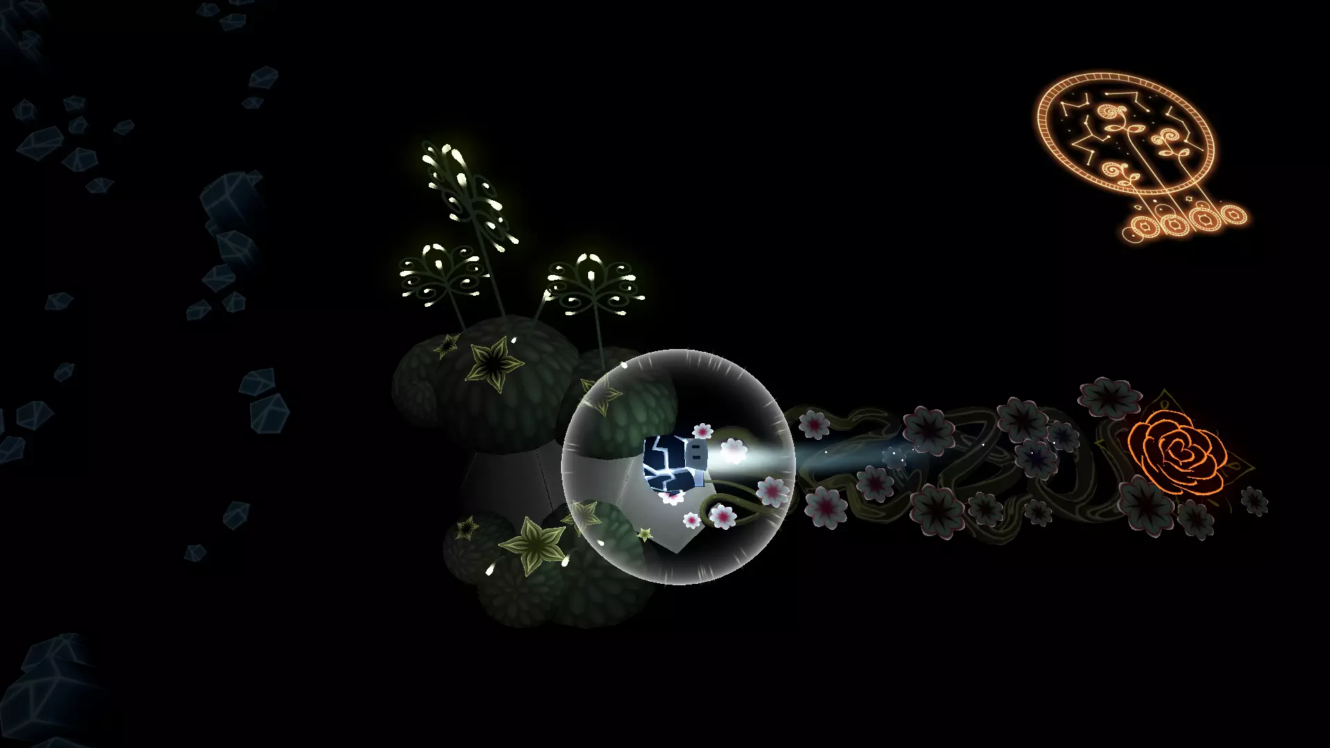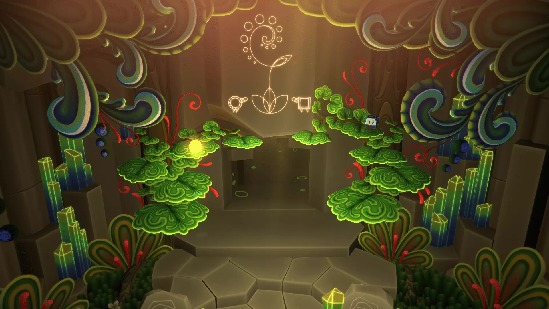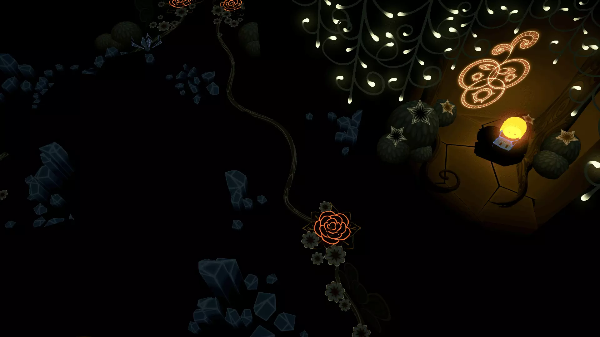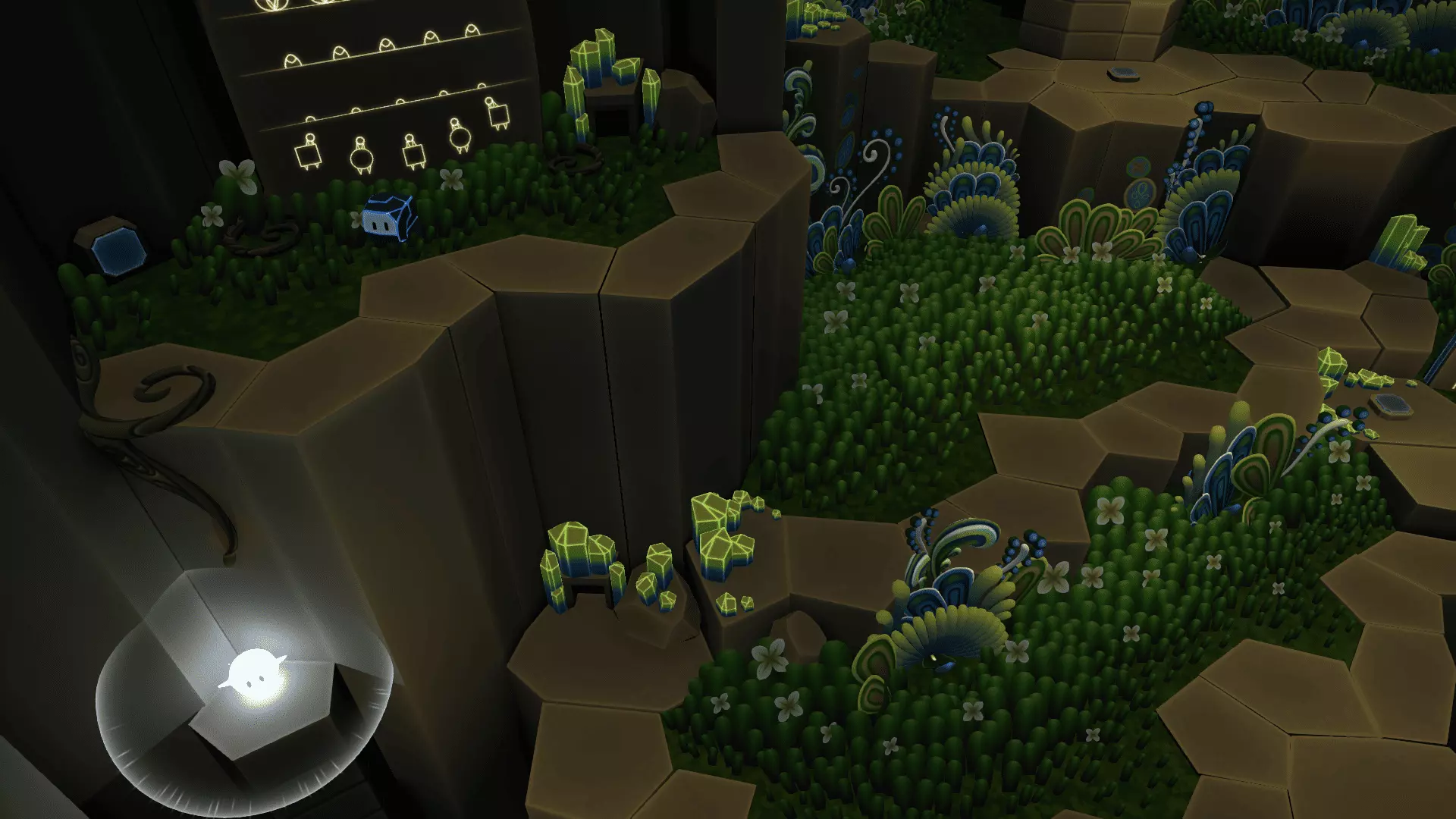 20/22首先找到洞穴尽头的花朵。把光点留在花朵上然后返回。在那里我们需要找到另一朵花。石头会吃掉星星,星星会把光点吸引回来!光点必须像图片中那样照在花朵上,而不是试图把星星推到花朵那里。之后会出现桥梁,我们终于能获得这幅壁画了。