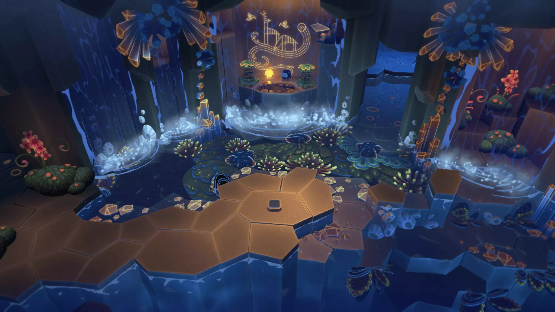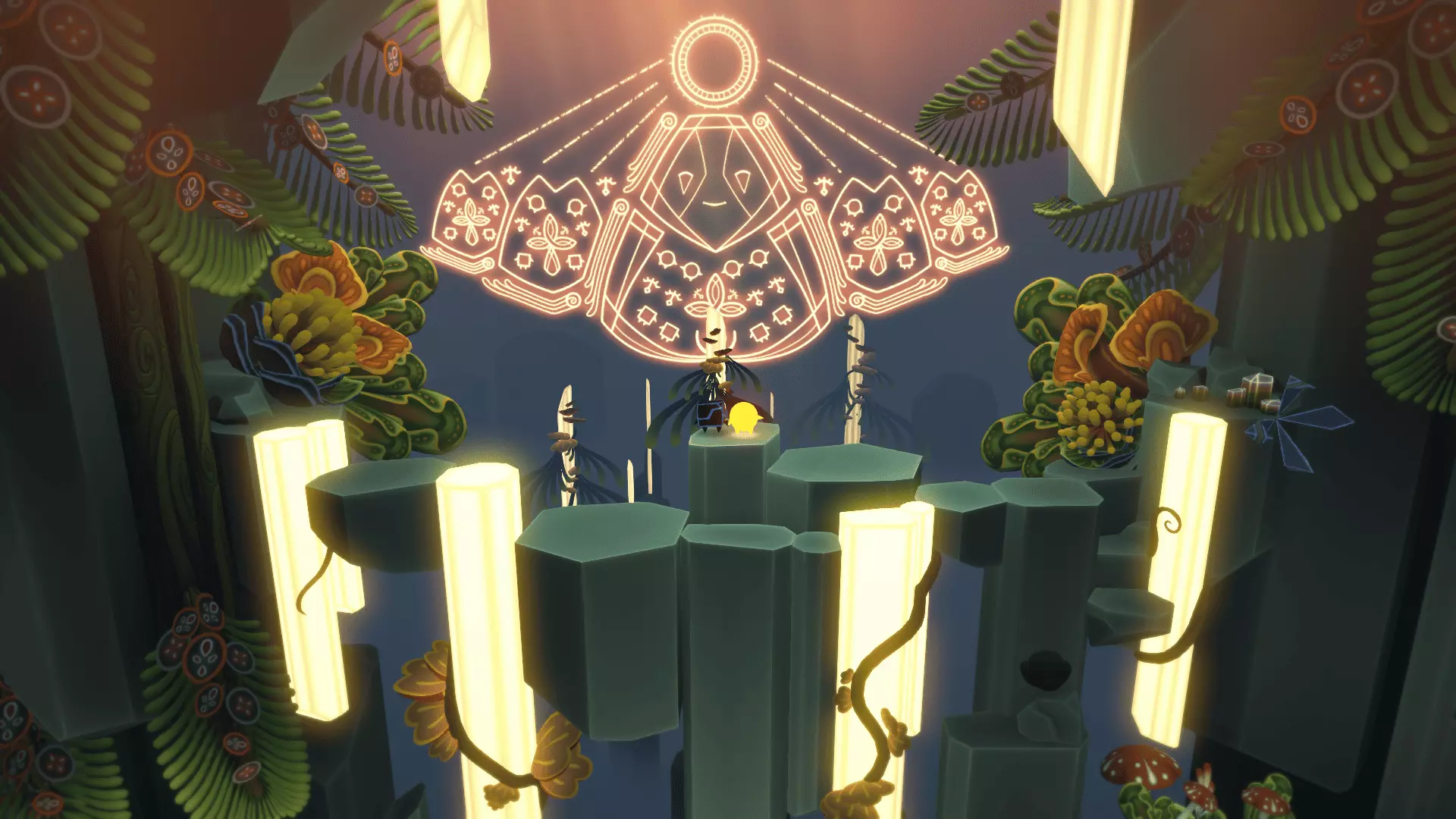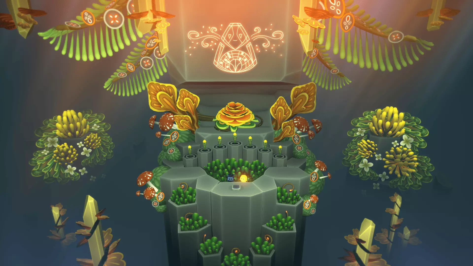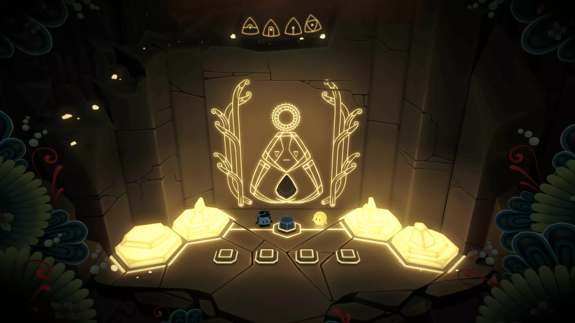 20/22首先找到洞穴尽头的花朵。把光点留在花朵上然后返回。在那里我们需要找到另一朵花。石头会吃掉星星,星星会把光点吸引回来!光点必须像图片中那样照在花朵上,而不是试图把星星推到花朵那里。之后会出现桥梁,我们终于能获得这幅壁画了。