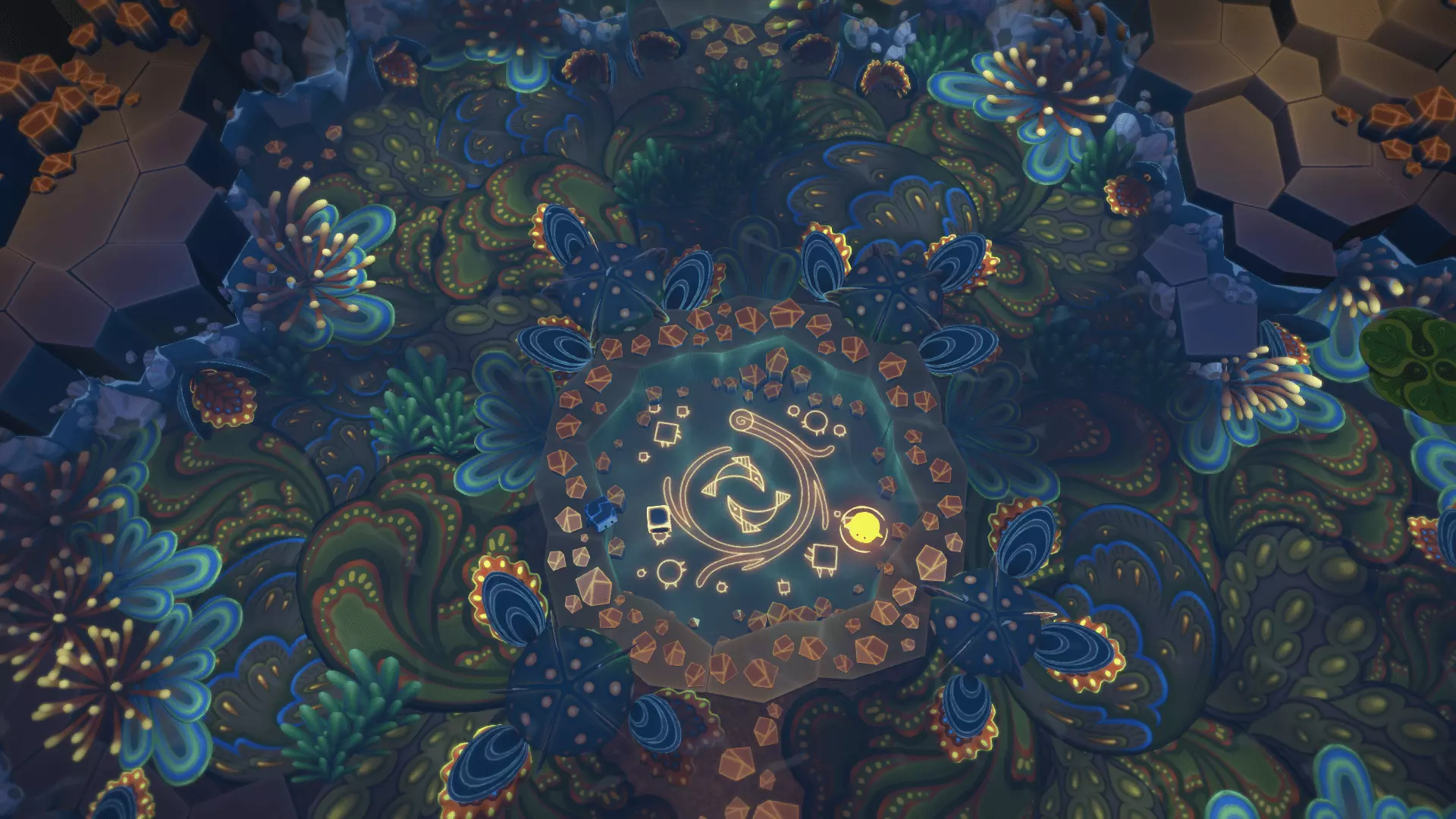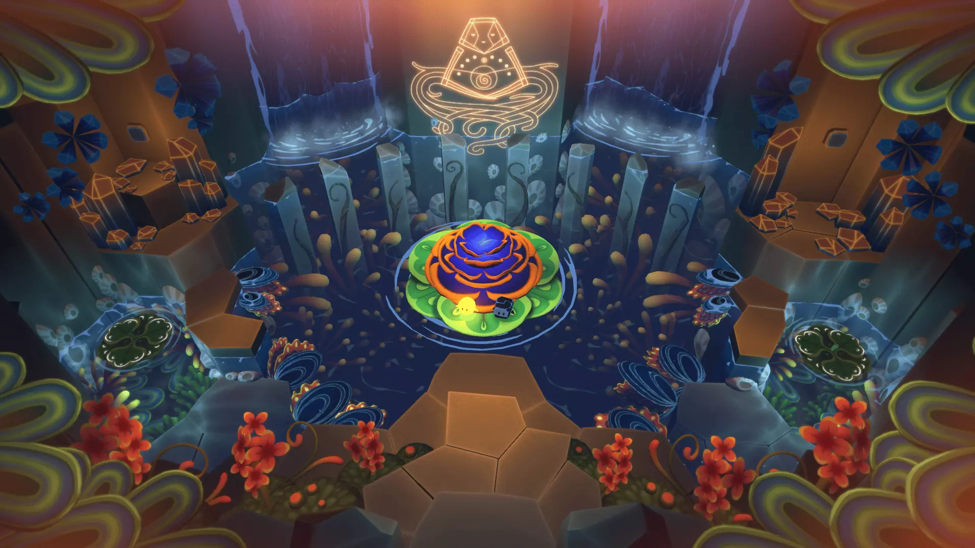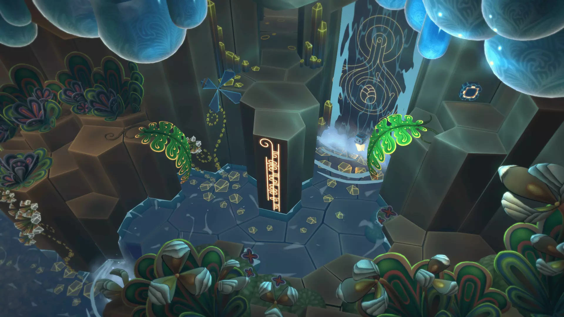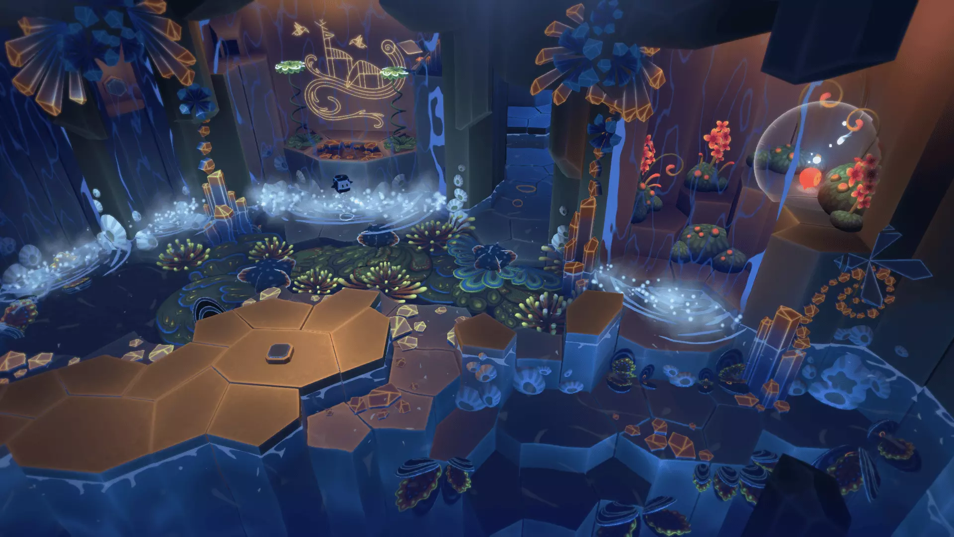 20/22首先找到洞穴尽头的花朵。把光点留在花朵上然后返回。在那里我们需要找到另一朵花。石头会吃掉星星,星星会把光点吸引回来!光点必须像图片中那样照在花朵上,而不是试图把星星推到花朵那里。之后会出现桥梁,我们终于能获得这幅壁画了。