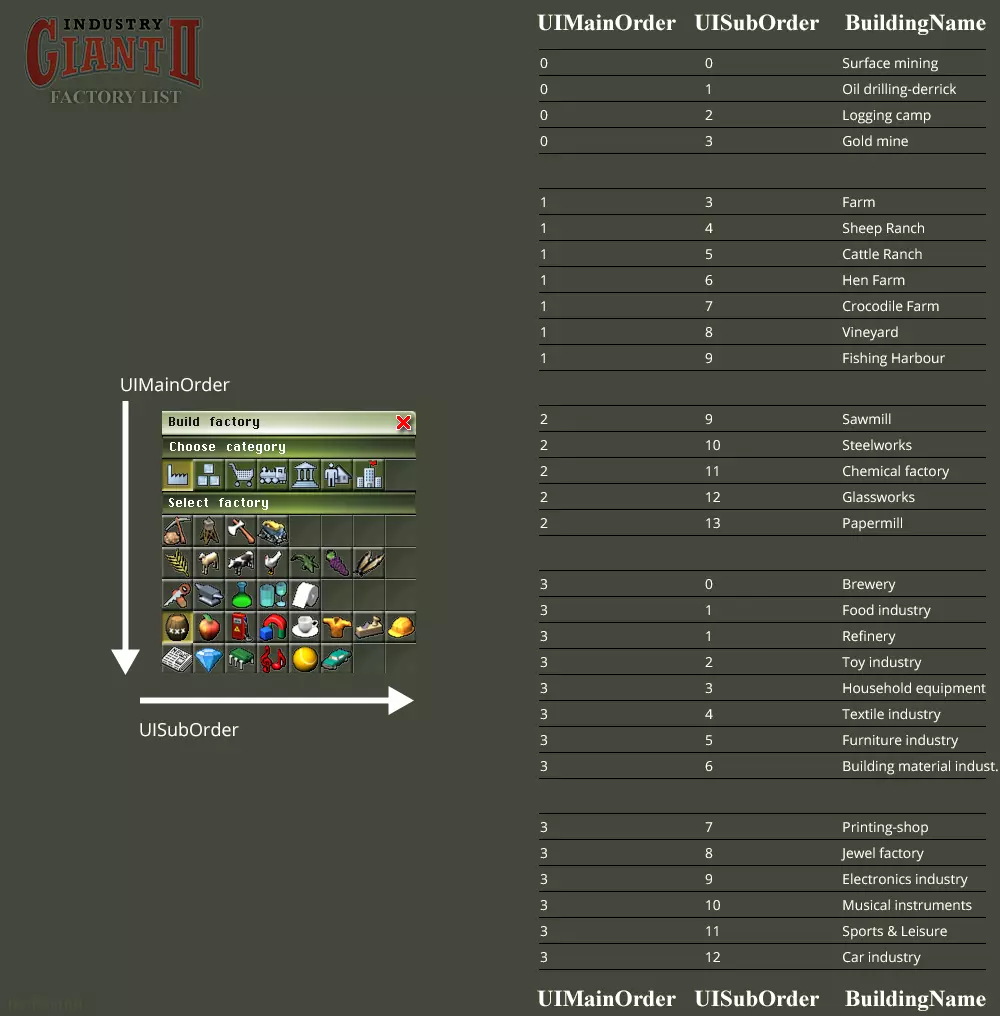 模组制作相关信息: 如何创建产品 [已完成] 如何创建工厂 [进行中] 如何创建仓库或车站 [未开始] 玩家相关信息: 关于产品成本、统计数据和图表(德语信息已翻译成英语) 简要信息 模组制作相关信息: 如何创建产品、工厂、仓库或车站(德语信息已翻译成英语) 包含内容: 工具 示例 图表 玩家产品相关信息: 包含内容: 表格 计算数据 图表 地图编辑器 用户及官方地图 包含《工业巨人2》的信息截图和部分文件《工业巨头2》任务指南(无解说)