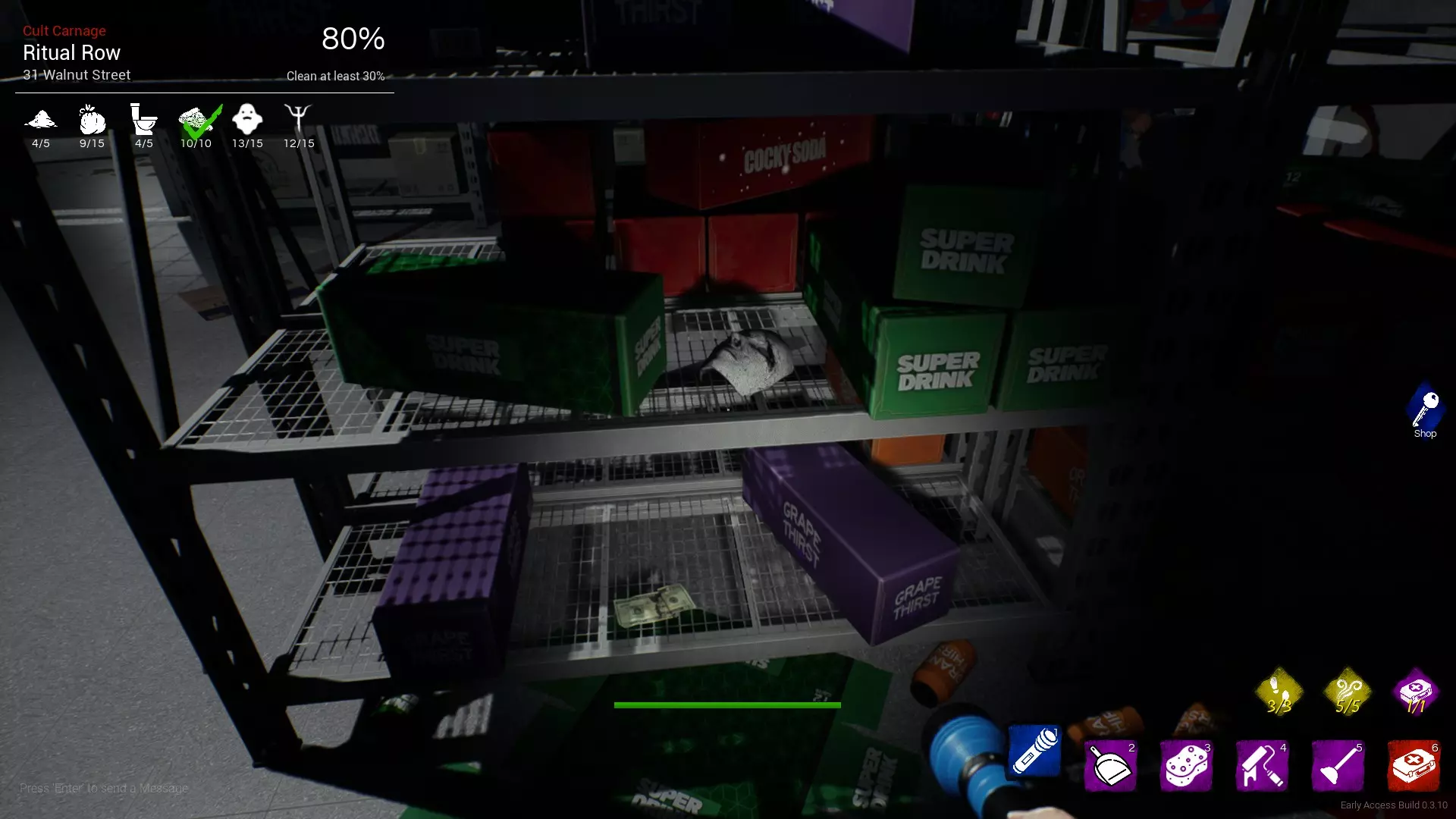 绿色汽水盒附近的货架上放着面具
