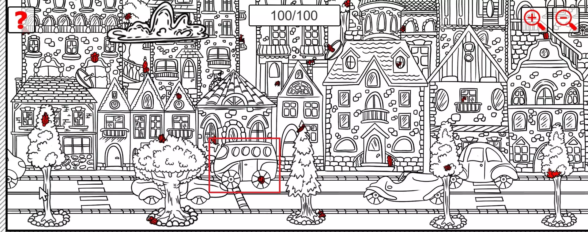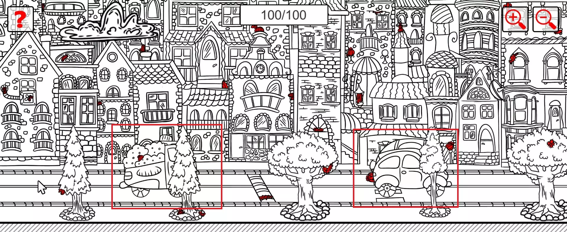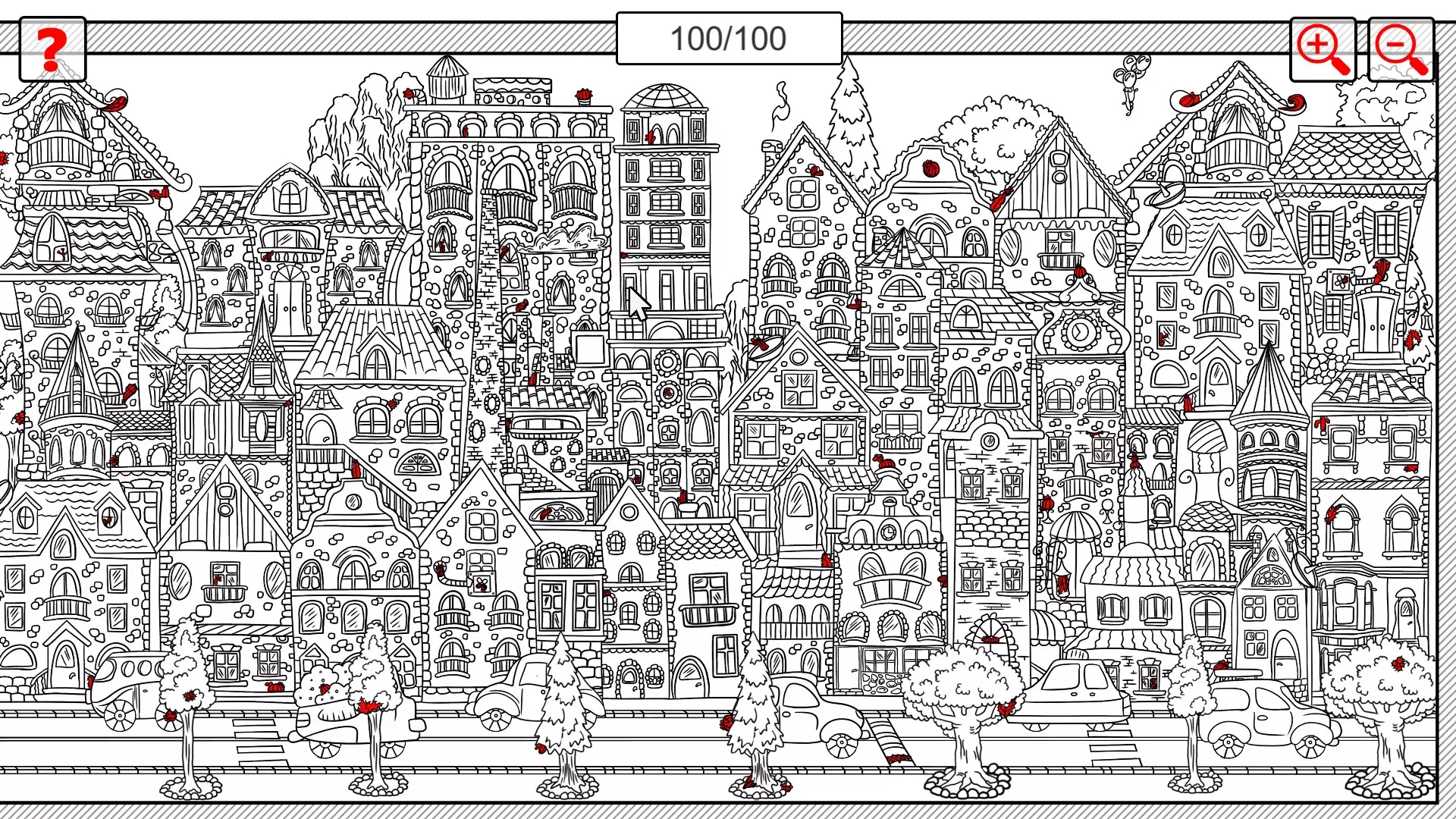 这是一款找物类游戏,玩家需要在充满房屋的城市场景图中,收集全部100个仙人掌,当前已完成全部仙人掌的收集,界面显示100/100的完成状态。