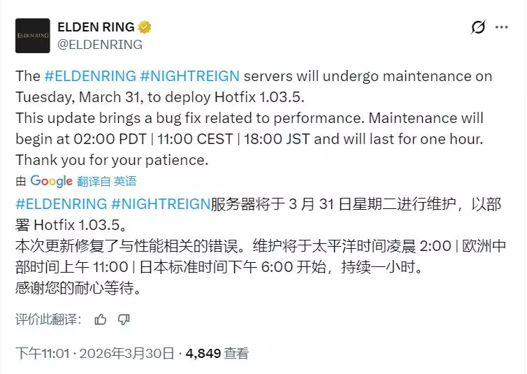 《艾尔登法环:黑夜君临》将于北京时间3月31日下午5点至6点进行1小时紧急服务器维护,推送Hotfix 1.03.5补丁,修复多人游戏连续特定动作卡顿等性能相关错误,维护期间可离线游玩。