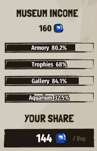 你可以投资登记册来提升博物馆收入,其受上述多种因素影响。 军械库 - 装备和武器的收藏。 战利品 - 这里是训练勋章和奖杯。 陈列室 - 你遇到的每个独特敌人都会在陈列室中添加新条目。 水族馆 - 每个独特的鱼类以及收集到每种鱼类的最大数量都会添加到此处。