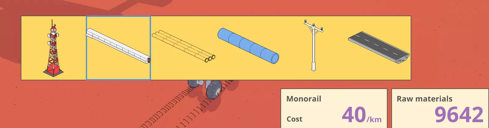 要开始建造,你需要先开采一些矿物,然后在建造工具中切换选择,确保已选中单轨铁路。在建造菜单中,按A键或D键可循环切换这些物品。