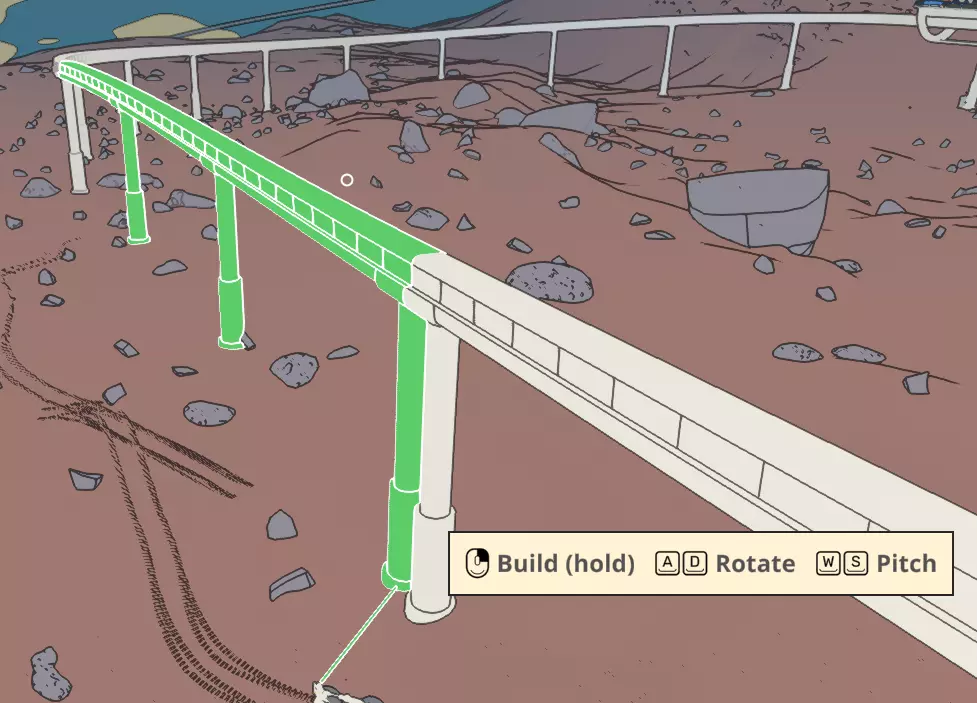 完成与建造单轨铁路相关的主线任务后,会随机生成要求你连接两个不同地点的支线任务。即使没有这些任务,你也可以在车站之间进行建造。你甚至可以先完成任务,然后根据自己的意愿删除整条线路或部分线路。 要建造单轨铁路,你必须靠近单轨车站,并选择单轨建造物品。单轨车站很容易识别,其标志是一个圆圈上延伸出一条线。左键点击将尝试从离光标位置最近的连接点开始建造单轨铁路。 你可以通过按A/D键来左右转向单轨铁路,按W/S键来上下弯曲轨道段。这些部件通常用于绕过地面障碍物,或调整轨道位置以使其对准目标方向。为了获得更好的操控性,并确保从正确的部件开始搭建,我发现最好养成查看想要从中搭建的单轨连接点的习惯。让我们看看使用非对向车站时的分步流程示例。