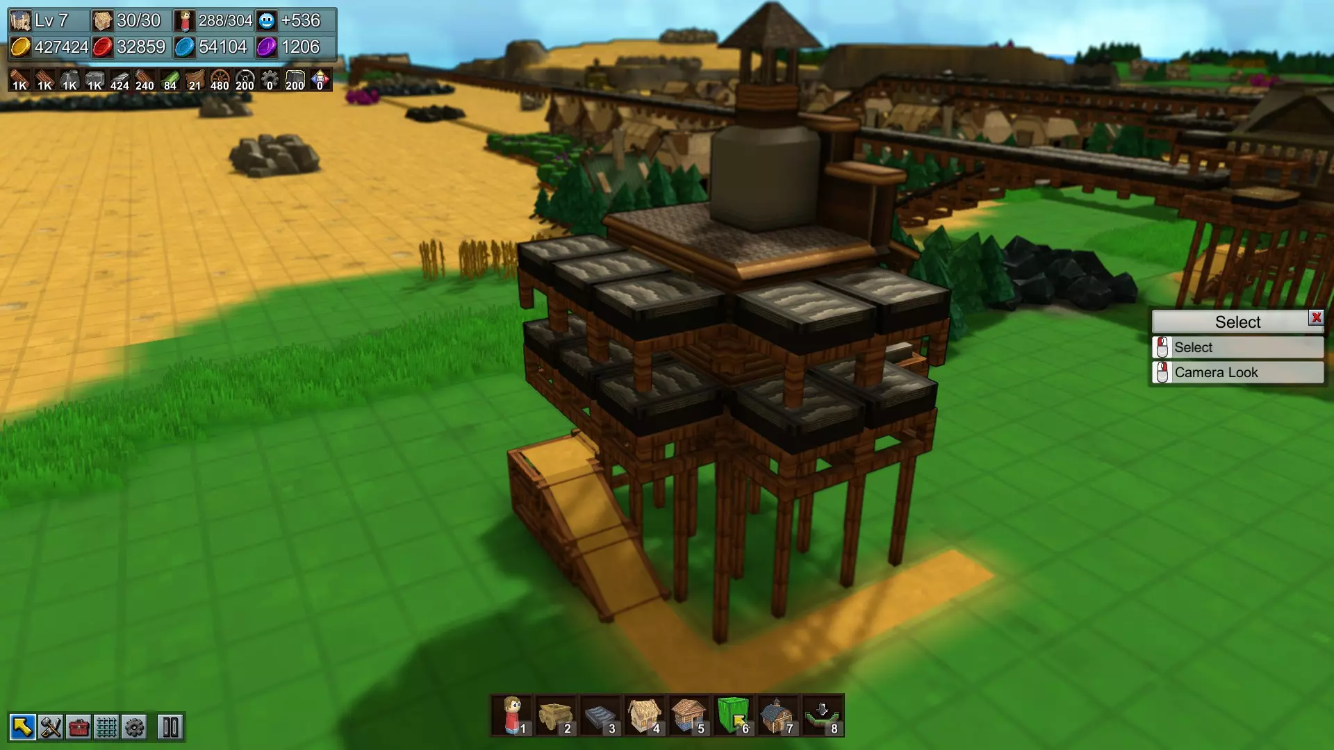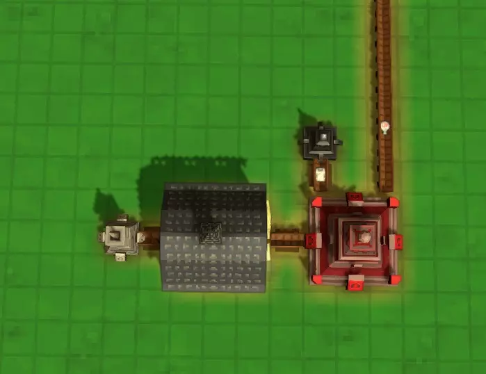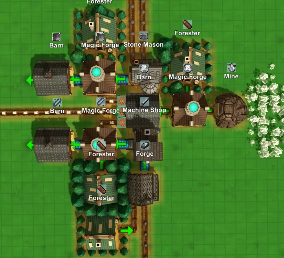 以下是我为这些物品设置生产的一种方式示例。你可以清晰地看到从水晶矿开始的生产链:水晶矿产出的水晶被送往熔炉加工,加工后的水晶储存在谷仓中,然后被分成三部分:一部分送往学校用于研究(通常对我来说学校都在比较远的地方),另外两部分分别送往魔法熔炉,一部分用来制造魔法砖块,另一部分用来制造魔法管道。 熔炉始终需要燃料,所以我在熔炉旁边放置了一个林场,以提供无限的木材,确保熔炉能持续运转。我发现这种方式比铺设长长的、复杂的运输路线来运送煤炭等其他燃料要方便得多。魔力管道也需要蒸汽管道,蒸汽管道由相邻的机械工坊生产。机械工坊只需要铁板,铁板由其相邻的熔炉生产,而熔炉的燃料由伐木工供应。熔炉只需要从某处运来铁矿石。如果你有足够的资源,可以在熔炉旁边建造两座铁矿,这样就不用再担心铁矿石的供应问题了。 在上方,魔力砖块需要石砖,因此有一个相邻的石匠铺在生产石砖。石匠铺只需要有石头来源,或者你也可以建造几个石矿来供应它。 一旦你的生产全部设置妥当(无论是否按照我的方法),你就会开始囤积魔力砖块和魔力管道。最终,你不再需要通过滑道或传送带将水晶跨地图送到你的学校。当这种情况发生时,你可以直接拆除那条长长的路径,在装满魔法水晶的仓库旁放置一个魔法传输器,这样水晶就能从仓库直接输送到传输器中。