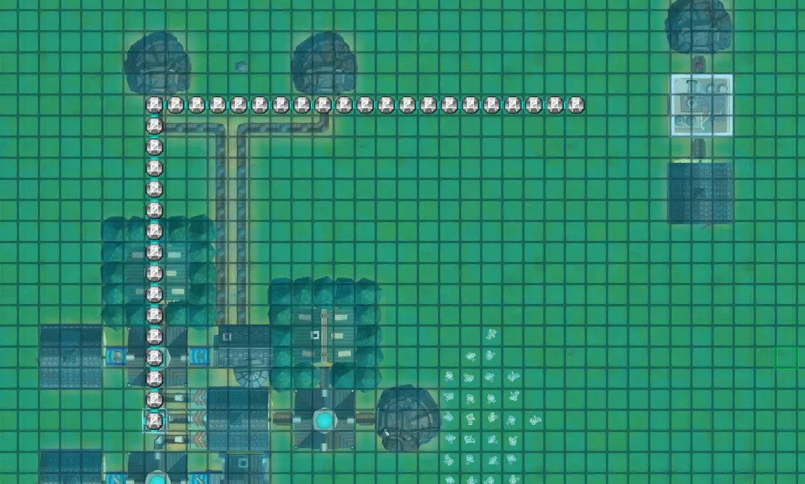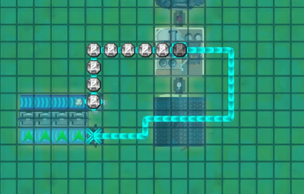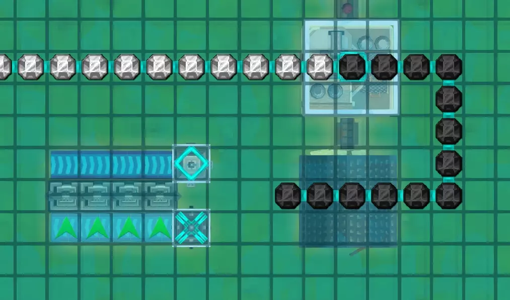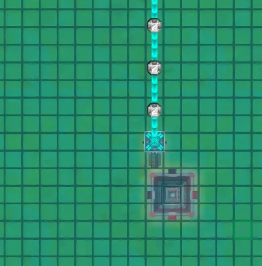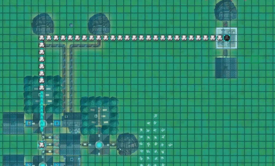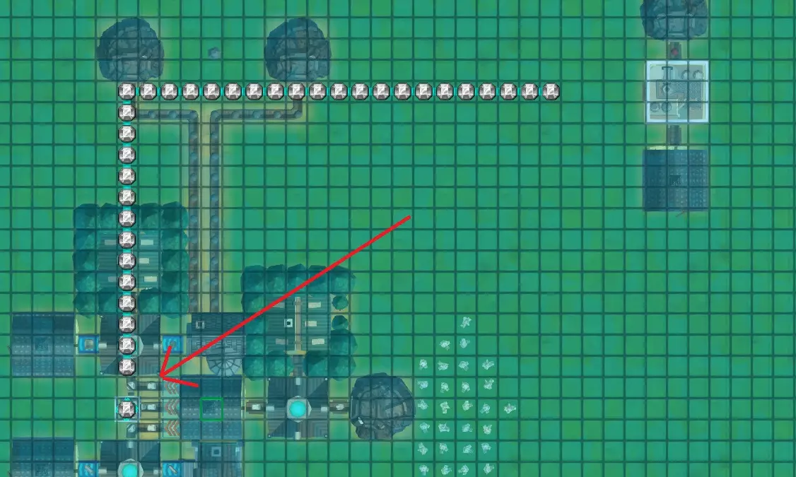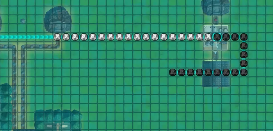 现在我们需要将魔力管道铺设到元素精炼厂(右上角)上方。魔力管道仅从建筑物上方经过是没有任何作用的,它们必须通过魔力连接管道与建筑物相连。你可以手动建造这些连接管道,但我从不这么做,因为如果你铺设魔力管道时,起点或终点位于需要魔力的建筑物上方的格子上,系统会自动创建一个连接器。它会显示为一个小方块。