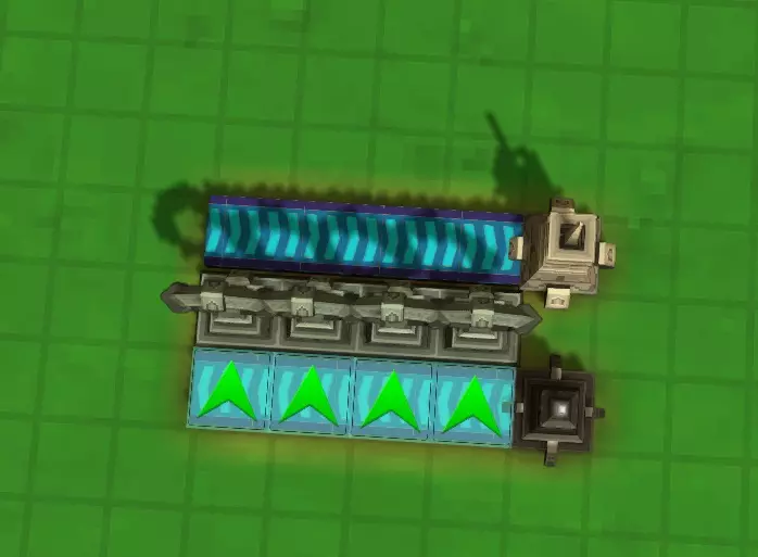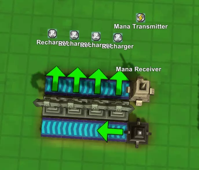 这是我设计的充电站版本。其他人可能会用其他方式建造,你最终也可能找到自己的方法,但我是这样做的。注意输出箭头的方向。你要确保接收器的输出能进入下方的传送带,并且所有魔力充能器输出的传送带都要通向魔力发射器。最后,你需要在远离魔力接收器的传送带上放置一系列推送器(如果你想搞点特别的,也可以用分流器)。这些推送器是用来将黑色水晶推入魔力充能器的。