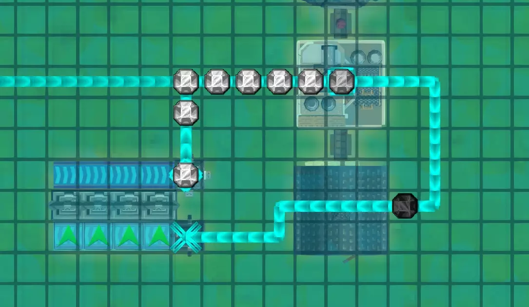 既然我们的充电站已经完成,现在回到魔力管道铺设模式。从这里开始,将你现有的装满黑色耗尽魔力水晶的管道连接到魔力接收器。它们会开始流入接收器,并被倾倒到下方的传送带上,然后被推送到魔力充能器中。魔力充能器会缓慢地将它们重新充能为满能量的魔力水晶,之后将其吐出到另一条传送带上,这条传送带会把水晶倾倒进魔力发射器。 接下来,你只需从魔力发射器绘制一条管道,连接回建筑物上的接口。在这种情况下,我会直接向上绘制管道,与已经穿过建筑物的管道相连接。