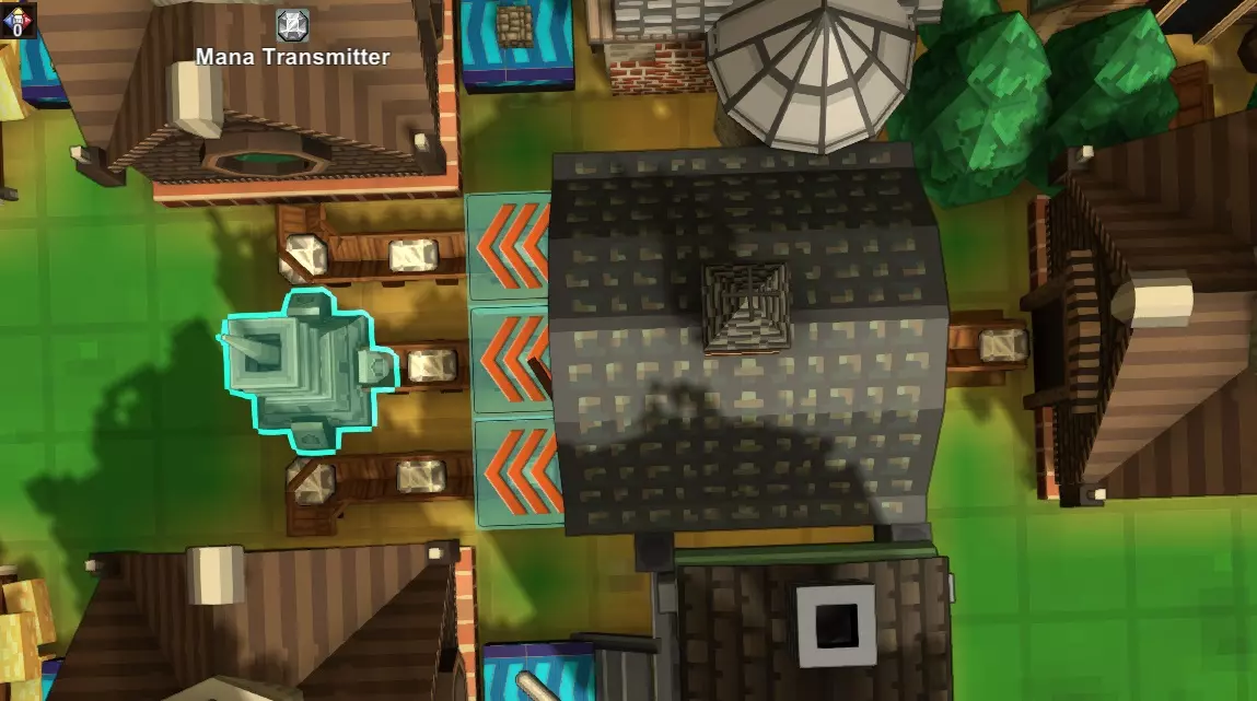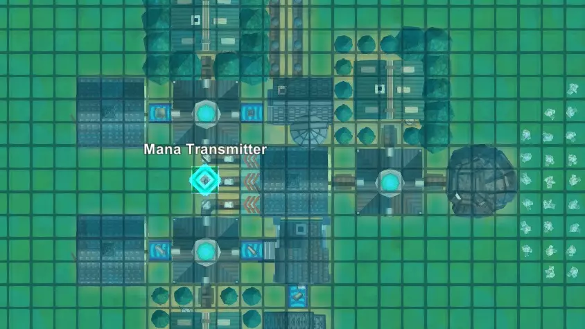 第三步:魔力能量 现在你已经将魔力水晶输入到魔力发射器中,打开建造菜单并选择魔力管道。进入魔力管道建造模式后,视角会切换为俯视,所有物体都会被淡蓝色调覆盖。你还会看到魔力发射器、接收器和连接器在网格上发光。将鼠标悬停在这些物体上会显示它们的名称,但一旦习惯了这些符号,就很容易记住它们。