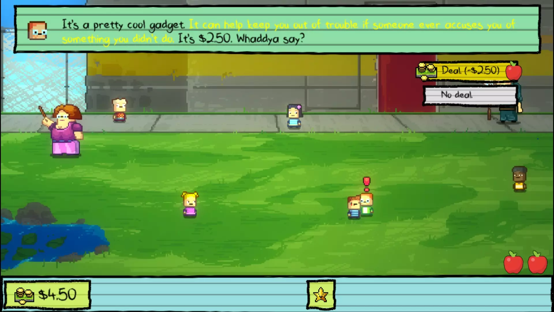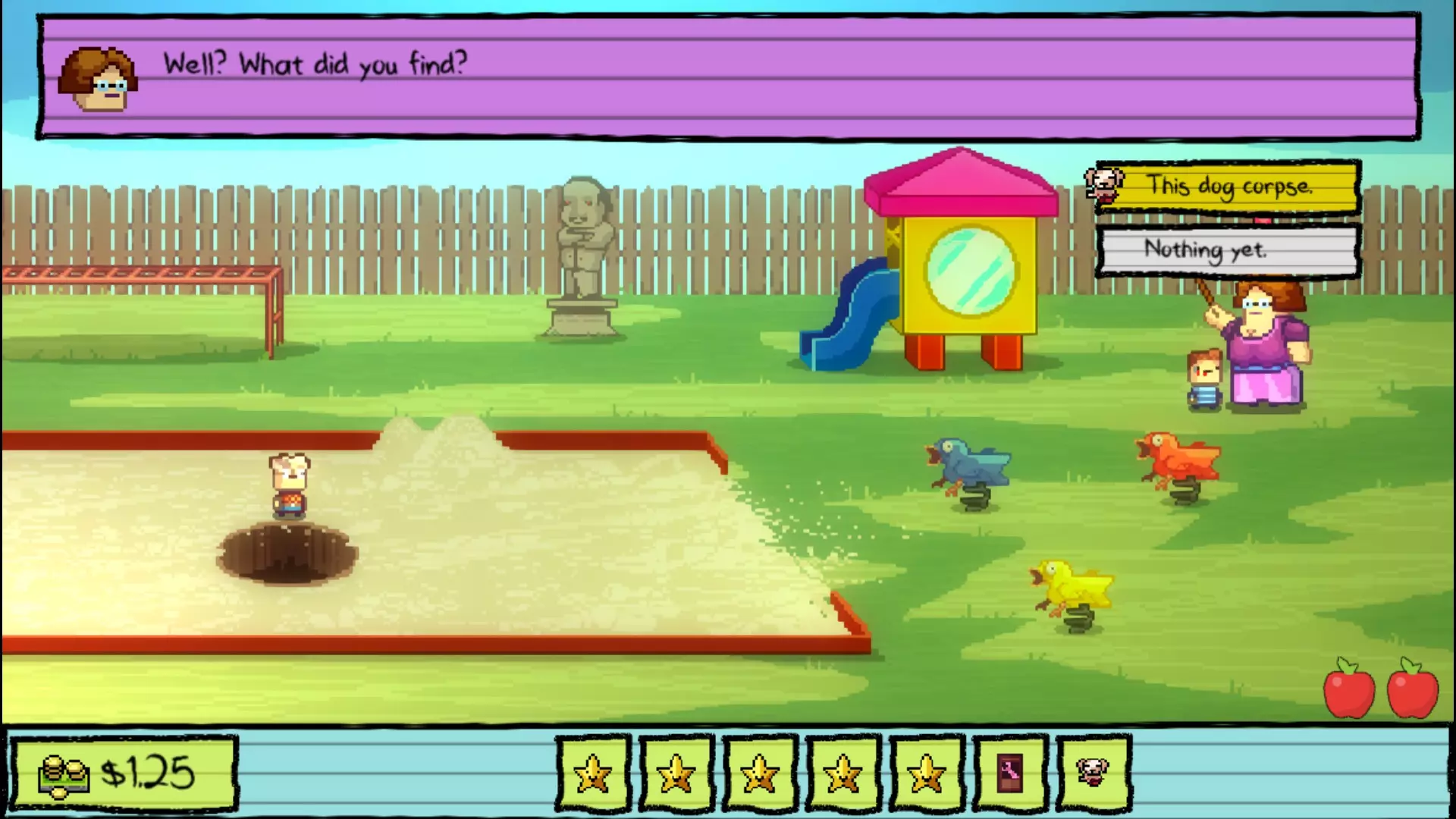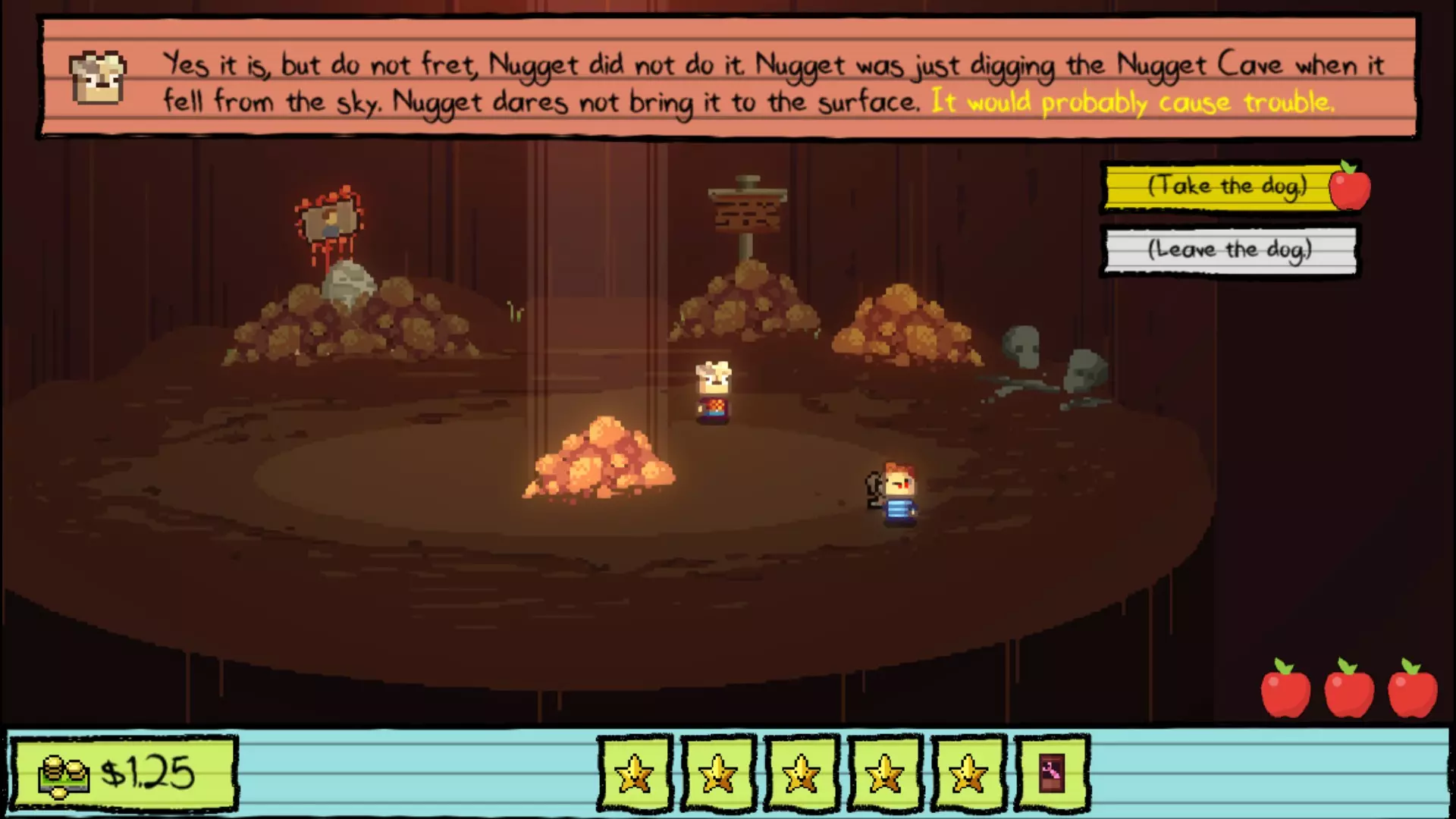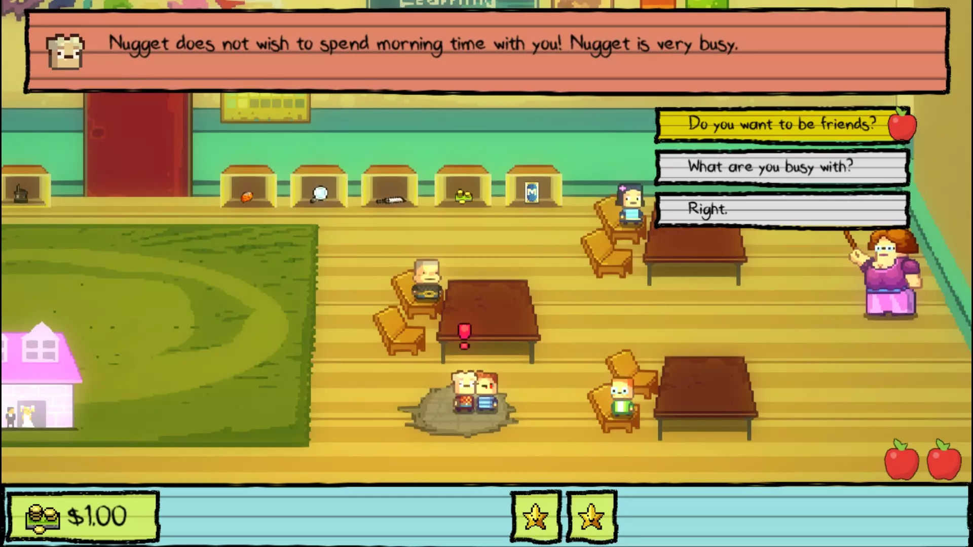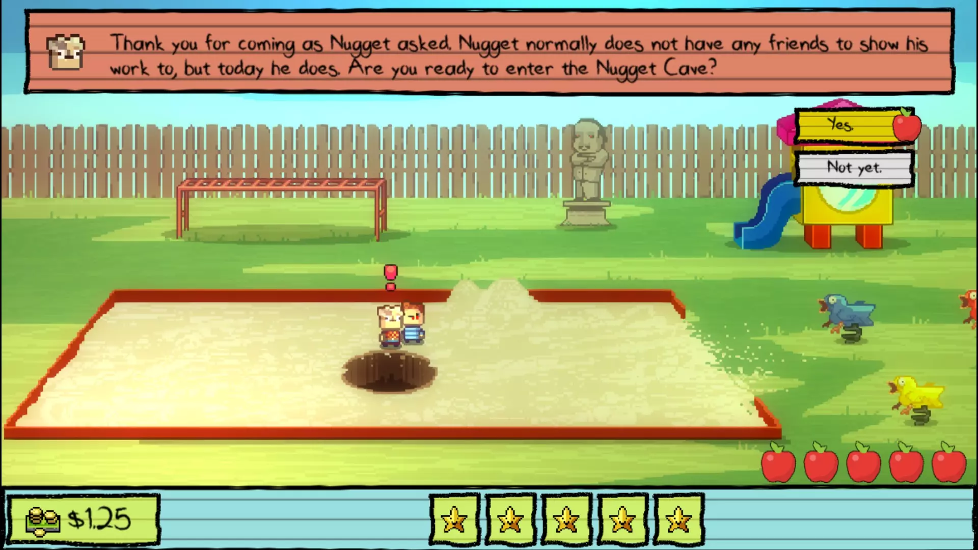 课间休息 和阿普尔盖特老师对话,她会根据你目前已解决的学生数量奖励你金星。现在只剩下 Nugget 了,所以去和他对话并进入 Nugget 洞穴。