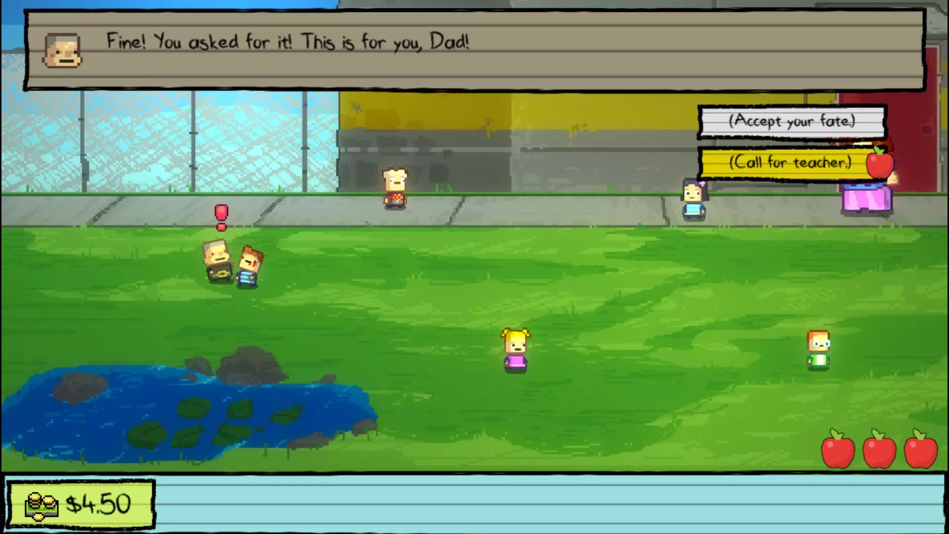 回到巴格斯身边并和他打架。就在他快要把你打死之前,向阿普尔盖特老师求救,这样他就会被送到校长办公室。