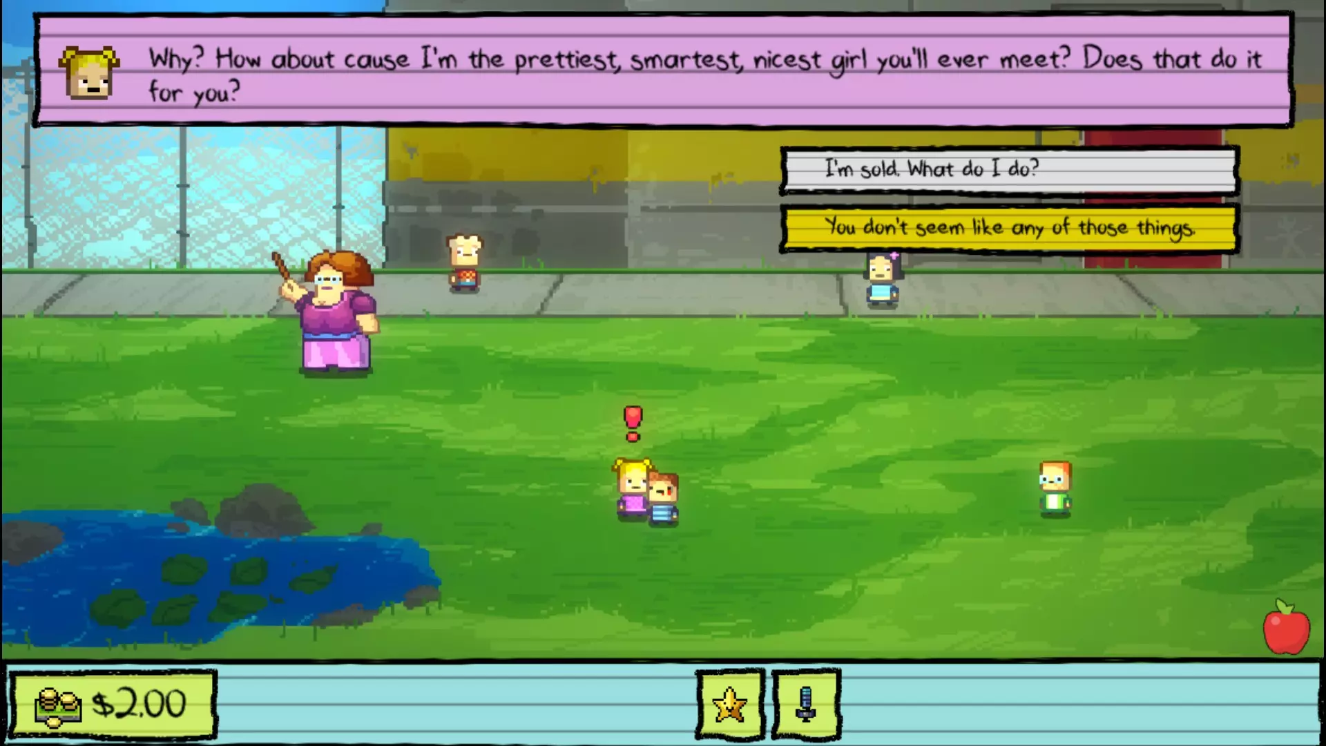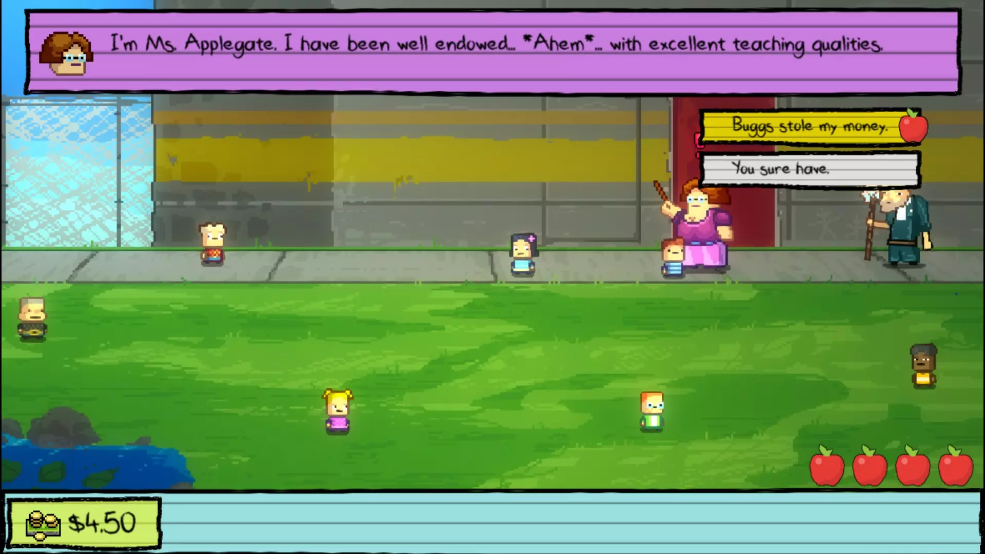 操场 你一进去,巴格斯就会偷你的钱——同意给他一半,然后向阿普尔盖特老师举报他——她会接着告诉你她打算开除/杀掉所有她不喜欢的学生的阴谋。