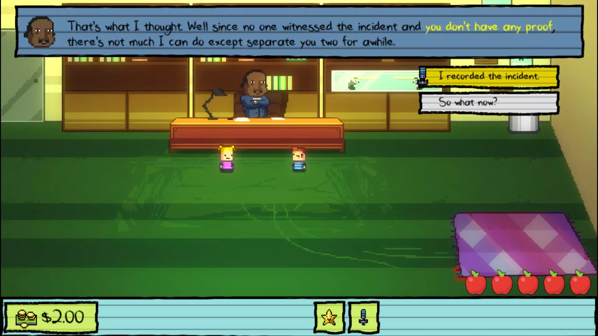 早晨时间 在校长办公室,否认辛迪的指控,并告诉他你用录音笔录下了整个事件。你会被放过,而辛迪会被开除。