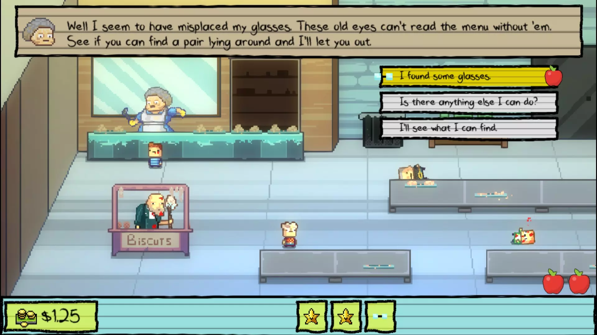 现在我们得对付莉莉。在你用掉第一个苹果后,你可能注意到她偷偷溜到走廊里了。和午餐阿姨说话,问她你能不能去卫生间。为了让她同意你离开,你可以选择付她2美元,或者把莉莉储物柜里的放大镜给她(在晨间时间,如果你告诉阿普尔盖特老师杰罗姆觉得你不够酷,她会允许你从储物柜里偷东西),或者最简单直接的办法,把蒙蒂的眼镜给她。