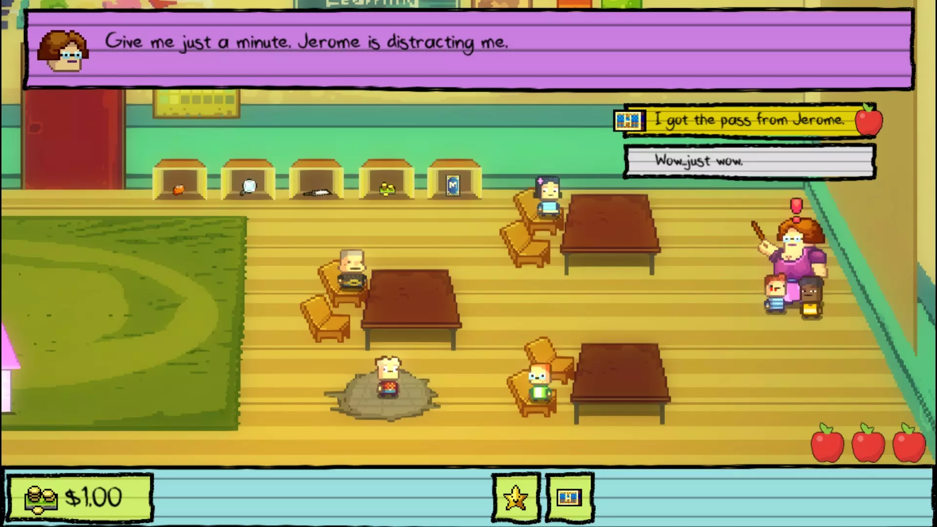 回到教室,和阿普尔盖特老师交谈,她会透露要让杰罗姆被开除的计划。不过,在你向他证明自己很酷之前,他不会理你。和蒙蒂对话,买一个悠悠球(1.00美元)。