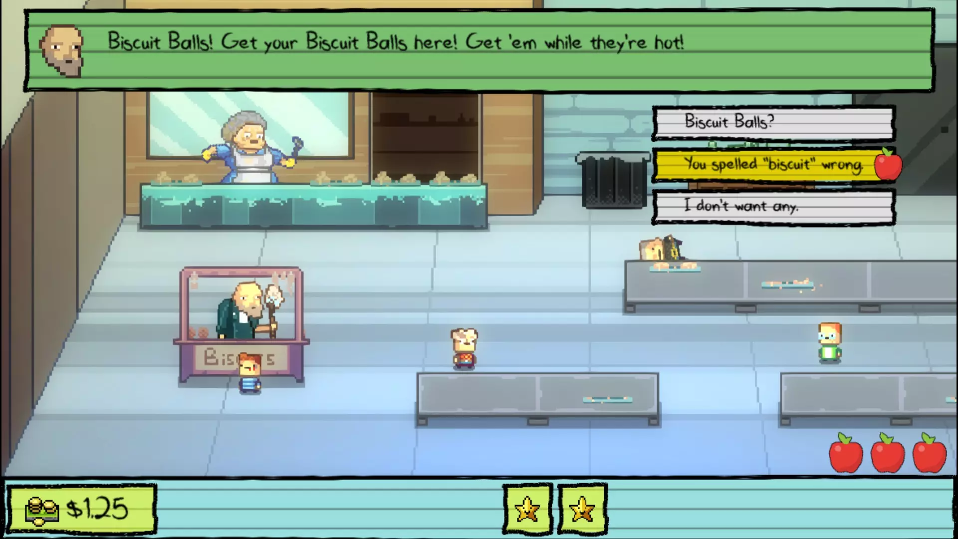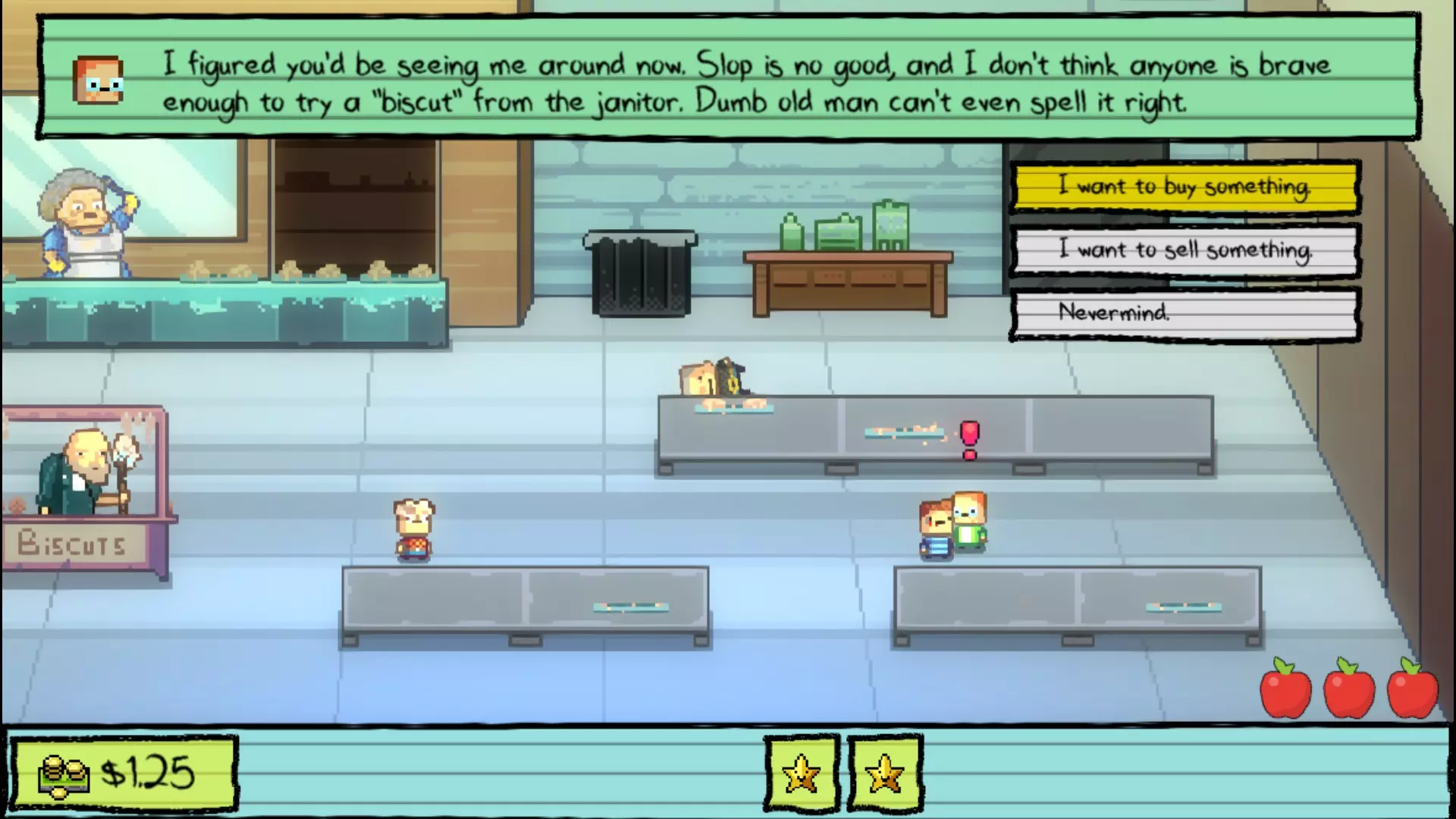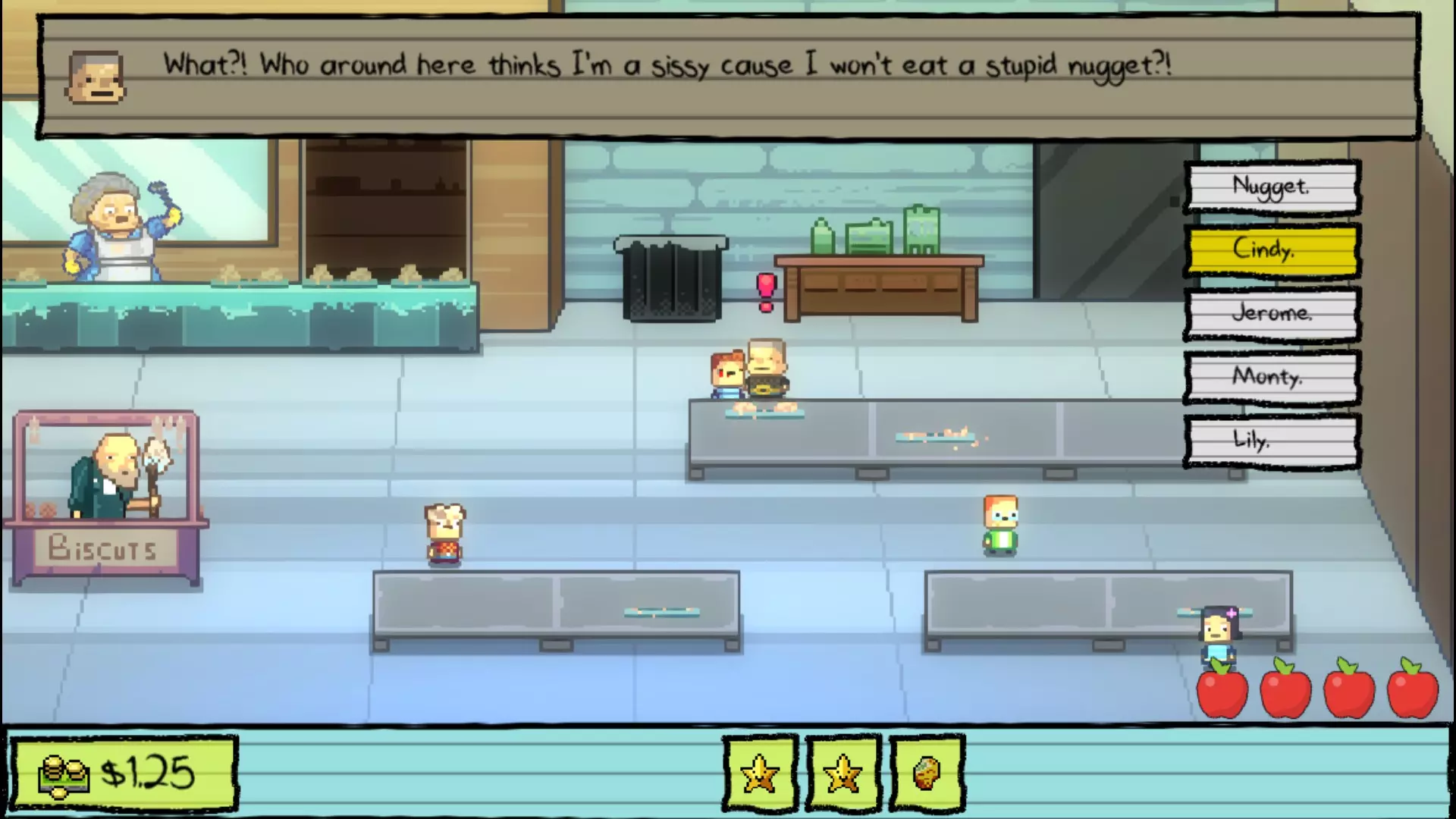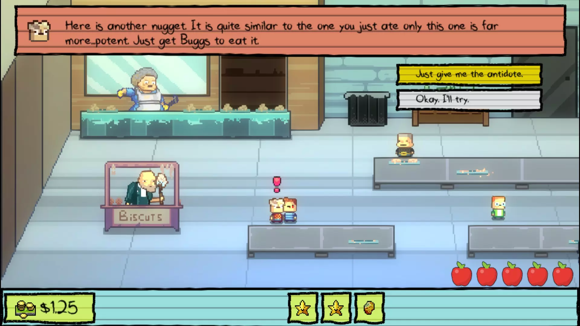 午餐 事实证明,那块可疑的鸡块里确实藏着毒药。所以为了拿到解药,你必须向 Nugget 的霸凌者 Buggs 复仇。他会给你另一块有毒的鸡块,让你拿去喂给 Buggs。